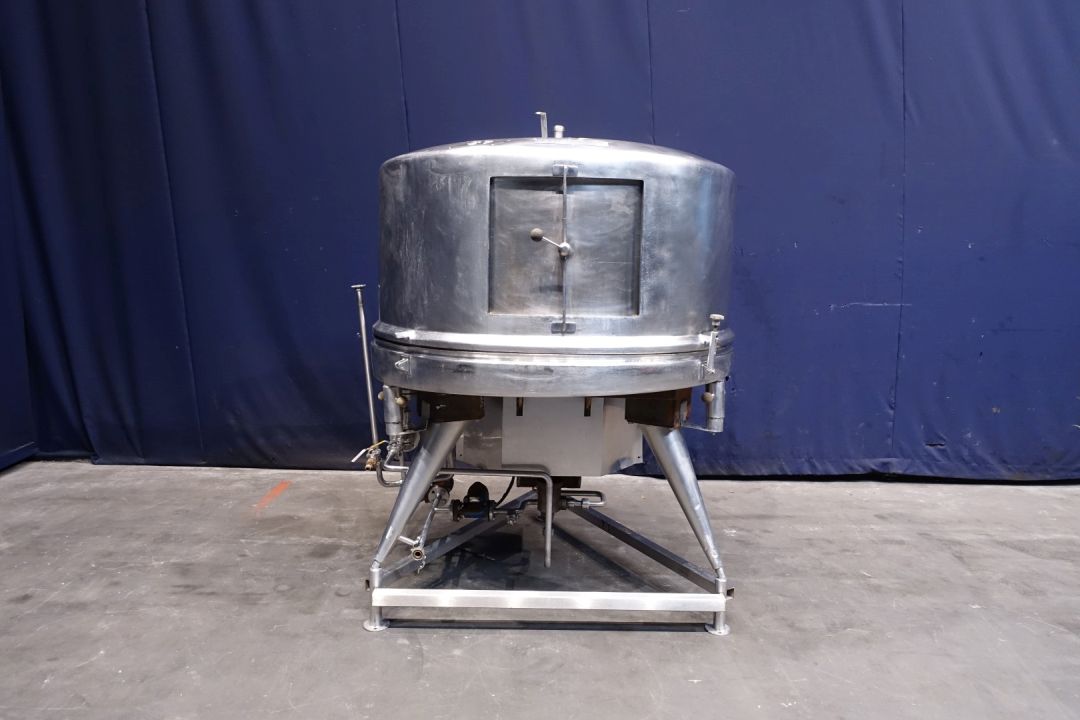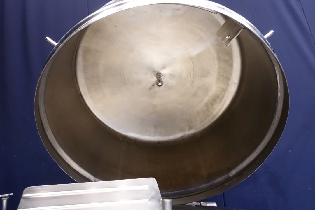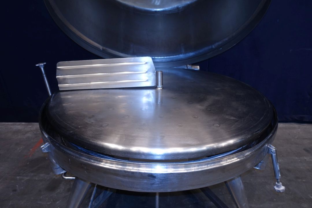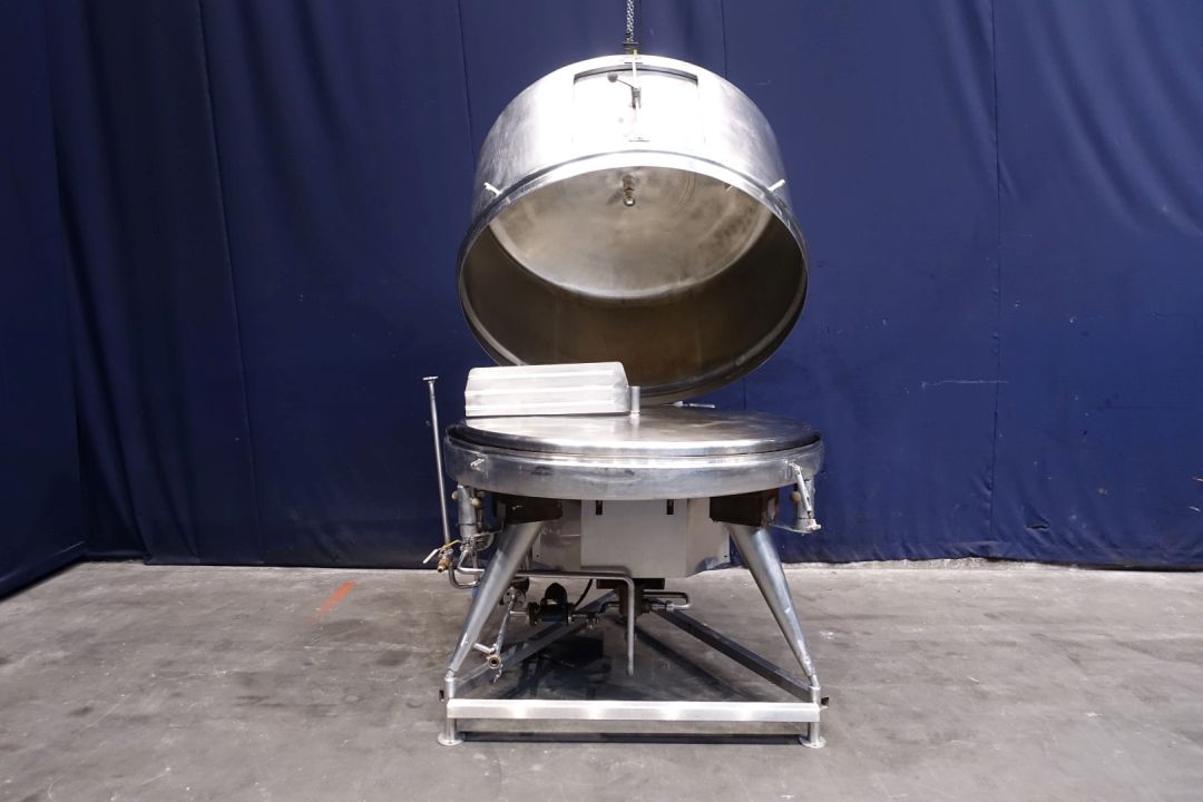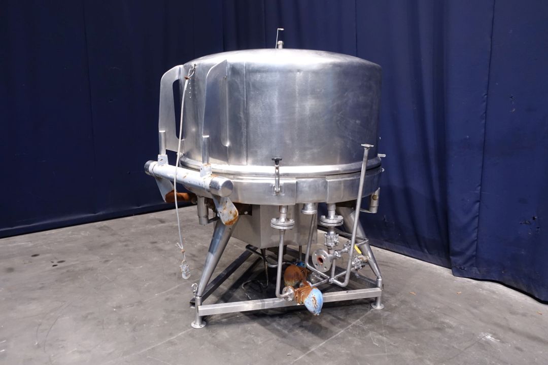 Closed butter melter with cover. Cover has a tilt system and a rectangular lid 50 x 43cm. With 1 motor and right angle reductor (no typeshield). CIP cleanable by 1 spray bowl in cover, connection 1,5". Diameter dish inside 135 cm round. Paddle 65 x 20 cm. Output DN65. For heating, steam system. Without controls and butter pumps. Total outside dimensions: 165 x 160 x 198 cm. Weight: ± .. kg. Cast iron steel gearbox. Variable speed. 2 Directions.