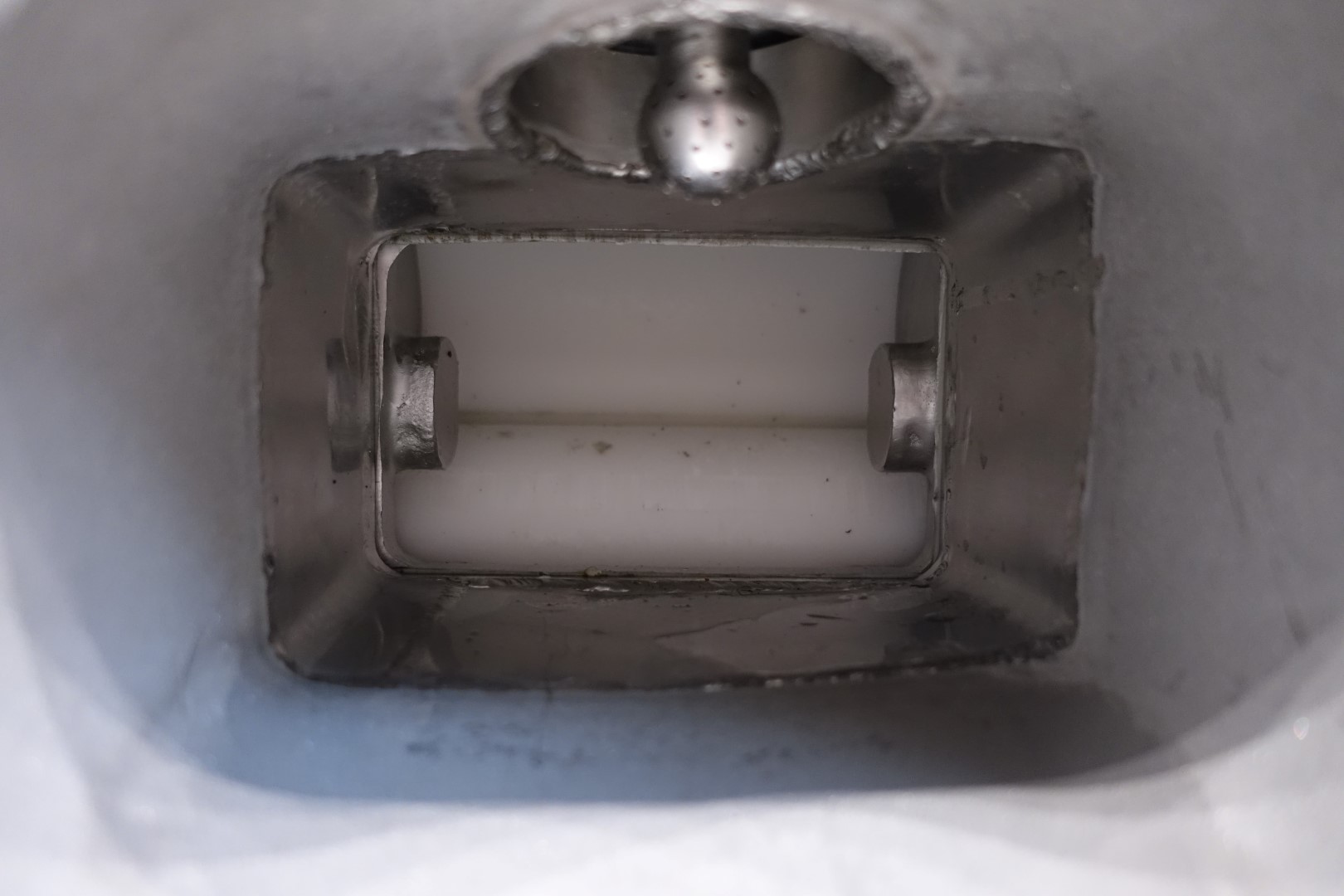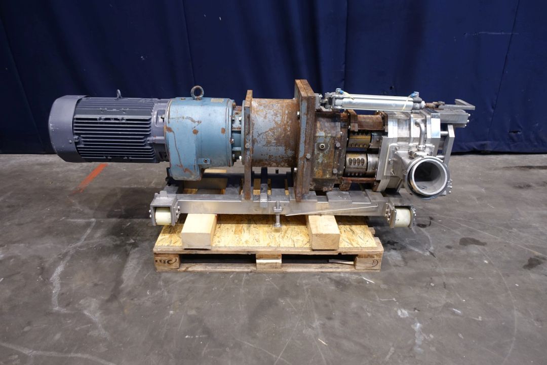 Butter lobbe pump with duo teflon lobbes. Current drive work: motor: 18,5 kW - 33,9 A - n1: 1.475 rpm, i=, n2: rpm. Cip cleanable - 1 x spray bowl. Connections: (in) 150 mm Din/ (out) rectangular flange / 1 x 1" SMS for cip-cleaning. Fabr. No. 96158. Total dimensions: 216 x 80 x 90 cm. Weight: 1.004 kg.