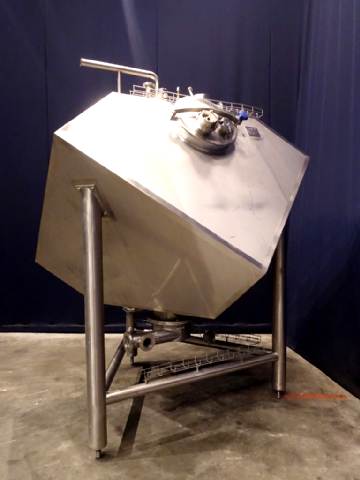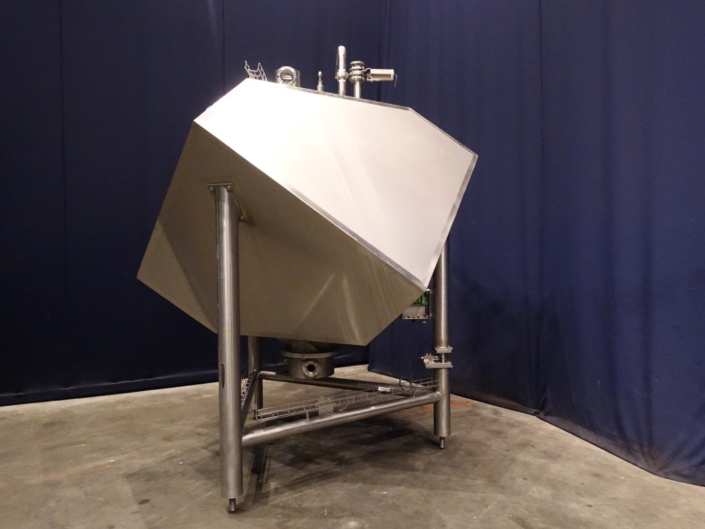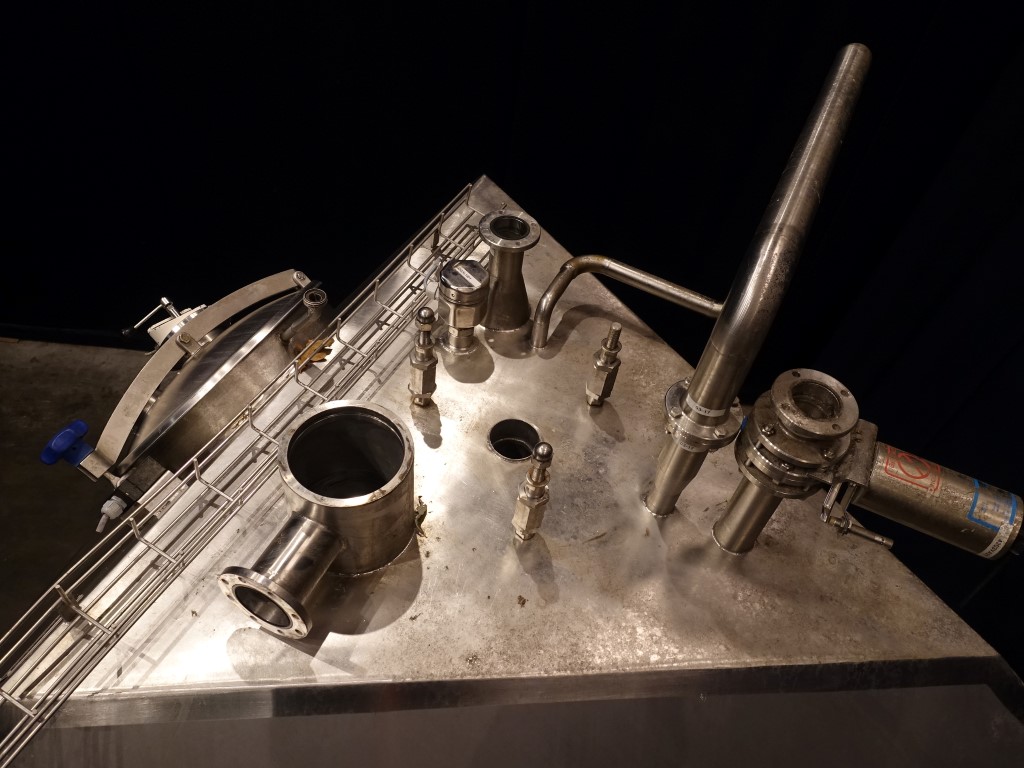 Tank of a Food tech poweder dissolver on loadcells. CIP cleanable with 5 spraybowls. Outlet DN65 flange and DN100 flange, outlet heigth: 59 cm. Motor and agitator excluded. Multiple ingredient inlets on top. Manhole diameter 45 cm. 3 adjustable feet, 1 with loadcell. Total dimensions: 210 x 210 x 280 cm. incomplete.