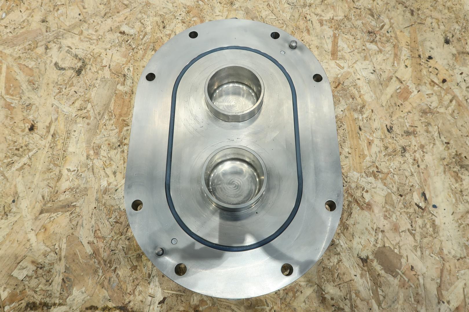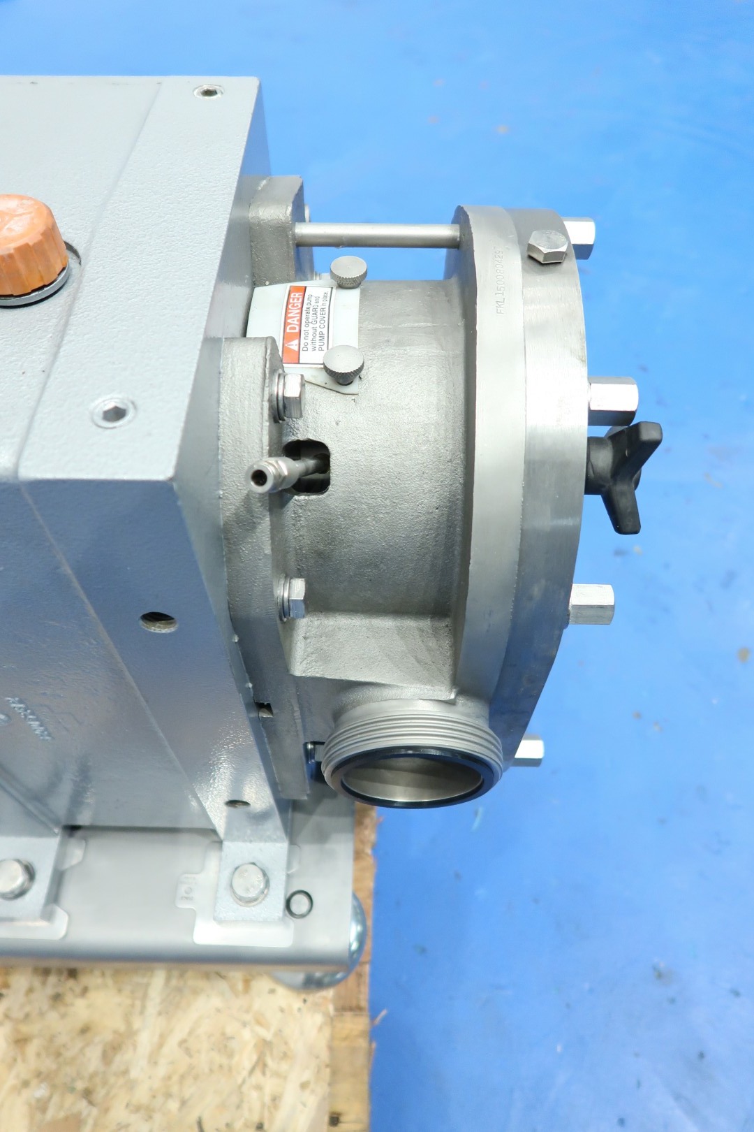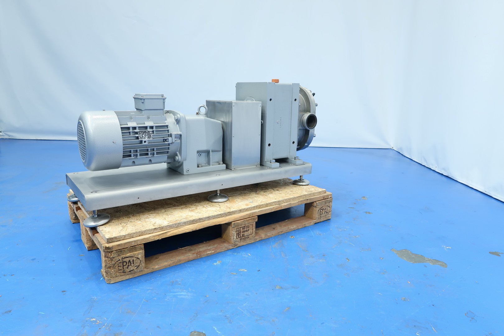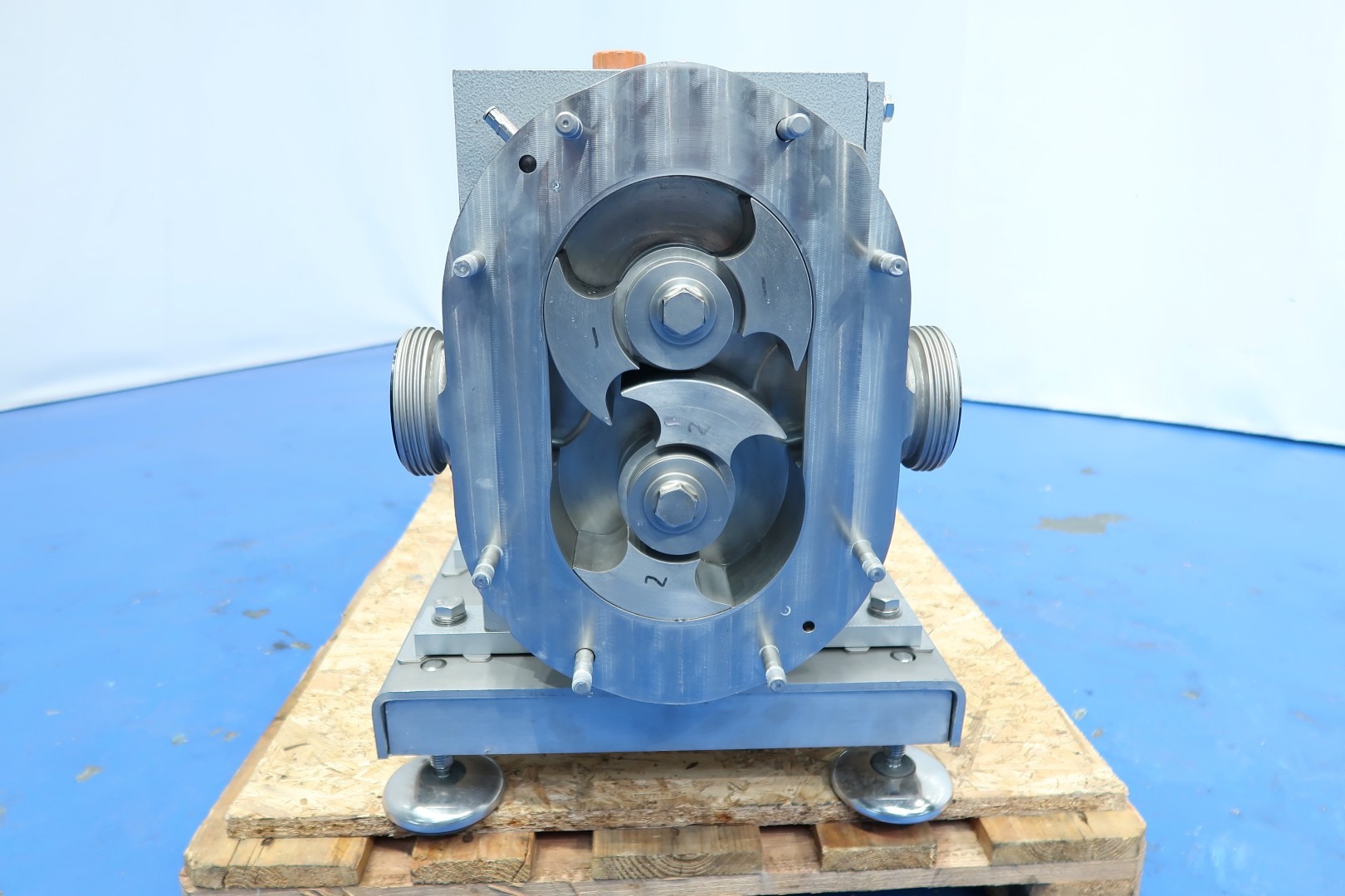 Rotary piston - lobbe - Positive displacement pump with duo stainless steel lobbes. already reconditioned. Diameter lobbes: 160 mm. Displacement per revolution: 0,98 ltr. Nominal capacity 21,3 m3/h. with drive work: motor: 7,5 kW - 14,8 A - n1: 1.445 rpm, i=6,2 - n2: 233 rpm. Design pressure up to 20 bar (300 psi). Mounted on plate with adjustable feet. Connections: (In) 3'' / 3'', SMS. Tested capacity with water (1cp) at 14.000ltr/h without pressure or 3.000ltr/h at 6.4bar pressure Dimensions: 130x45x60 (lxwxh) cm - Weight: 408 kg.