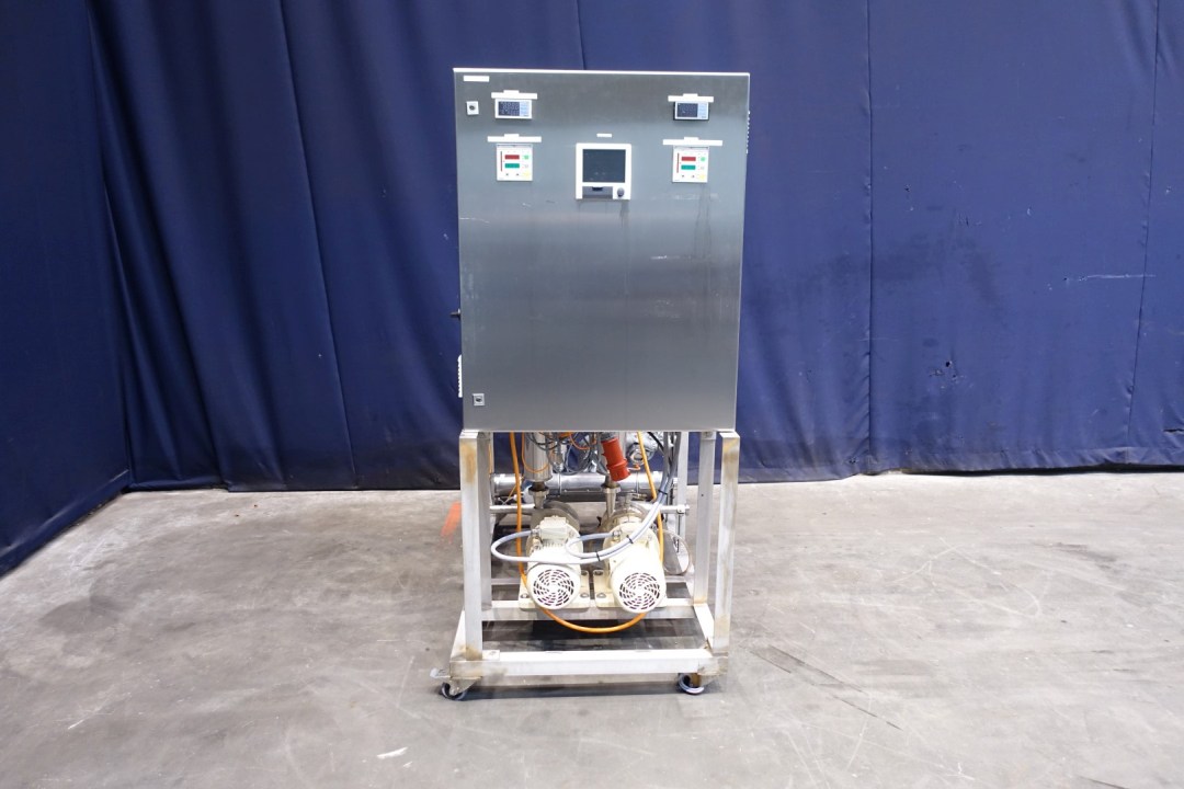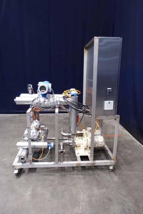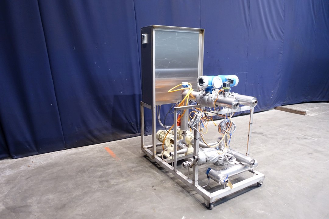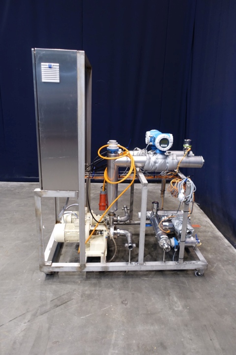 Unit to pump and measure and registrate 2 flows - temperatures and pressures between approx 500 and 5,000ltr/h. Complete mounted on mobile ss frame. With 2 x Fristam model: FP 712 centrifugal pumps, 2x E&H Promag 53 flowmeters. Control panel to regulate flow control in and out, pump control in percentage. With 3 x E&H temperature transmitters, 1 x pressure transmitter and 1 x E&H Ecograph T RSG35. 2 x Danfoss frequency convertors for the 2 x Fristam pumps. Connections: 10x 1" Din. Total dimensions: 150x85x185 (lxwxh) cm - weight 296 kg's.