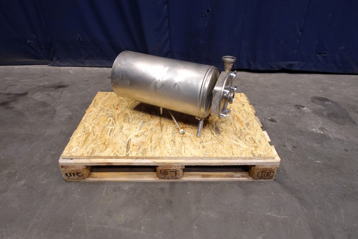 Sanitary centrifugal pump. motor: 5,5 kW - 12,5 A - 2.900 rpm - 50 Hz. Impellor diameter: 175 mm. Approx 4 bar. Connections: (in) 2" Din / (out) 2" Din. Total dimensions: 71x30x42 (lxwxh) cm.