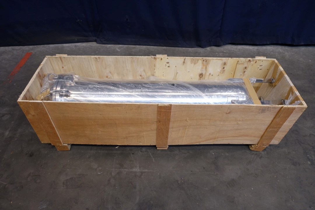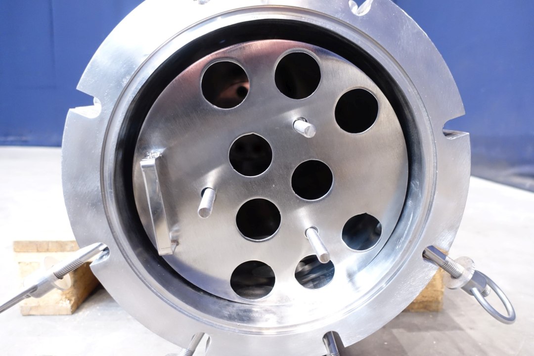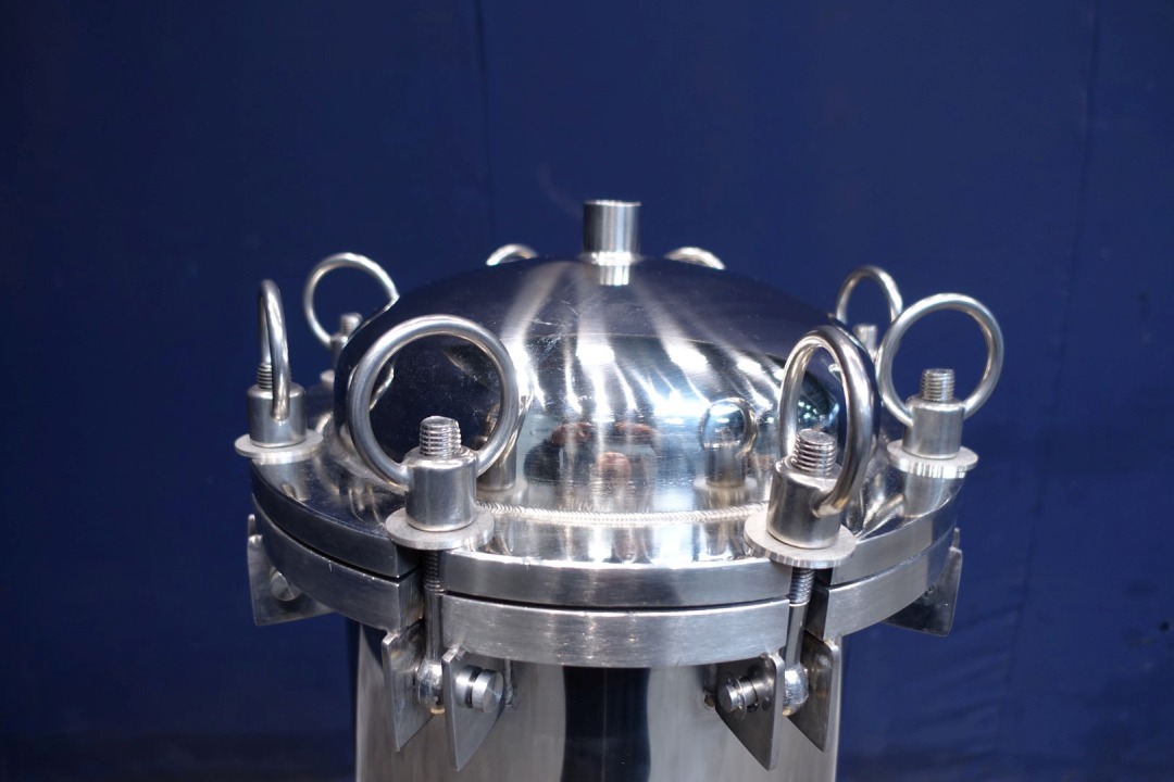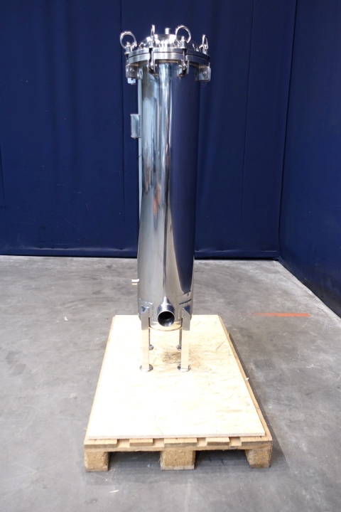 Vertical filter housing, unused, in original packaging. Including insert with a diameter of 43,18 mm per hole. Length filter house 108 cm. Sanitairy for liquids. Volume: 84 Ltr. Connections 2x 83 mm pipe and 3x 26 mm pipe. Only housing, excluding filters. Dimensions: 45x45x168 (lxwxh) cm - weight 91 kg.