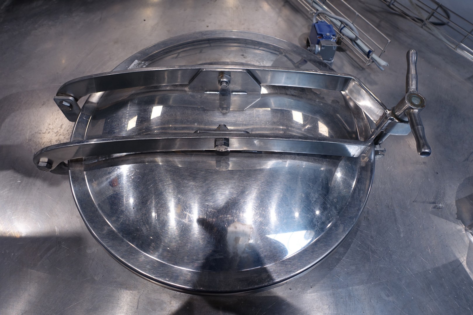Horizontal curd making vat. Double-O DB. Double jacketed. Whey suction device from the top with sensors. Manhole round 45 cm with safety guard with sensor. Higher placed legs (currently cut for transport). Drive motor 4,0 kW. CIP cleanable, equipped with two spray bowls. Breather on top with cip bowl, cip pipe with manual butterfly valve. Inspection lamp in top. Outlet (cheese curd) height (with legs) ca 35 cm, pipe diameter ca. 100mm. New controls and auxilieries can be offered on request. Operation manual and electrical diagram (in German) available. Total dimensions: 395x260x335 (lxwxh) cm - weight: 2.870 kg
