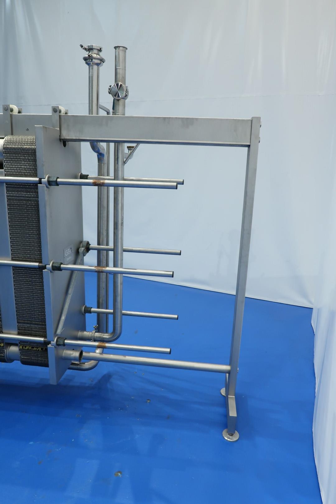 Milk pasteuriser unit, with Plate heat exchanger (PHE). Max pressure: 8 bar - max temperature: 130 °C. Beam length: 254 cm, connections: 10 x 2,5" Tryclamp. Current configuration 4 Sections: regeneration (2x), heating and cooling. temperature cycle: ± 4-55 (outlet to separator) - 75 - 4°C, 49-49-121-49 plates (total 268) - Connections head: 2 up, follower 2 down. With 1 x matching ringkey. Hotwater circulation pump (Grundfos NP 65-50-125) and Kelvion brazed hetatexchanger steam/hotwater (GBS 700L-60), part of piping and sensors. Dimensions PHE: 275x62x187 (lxwxh) - weight: 3.505 kg.
