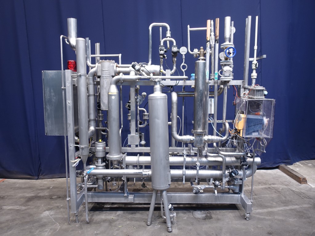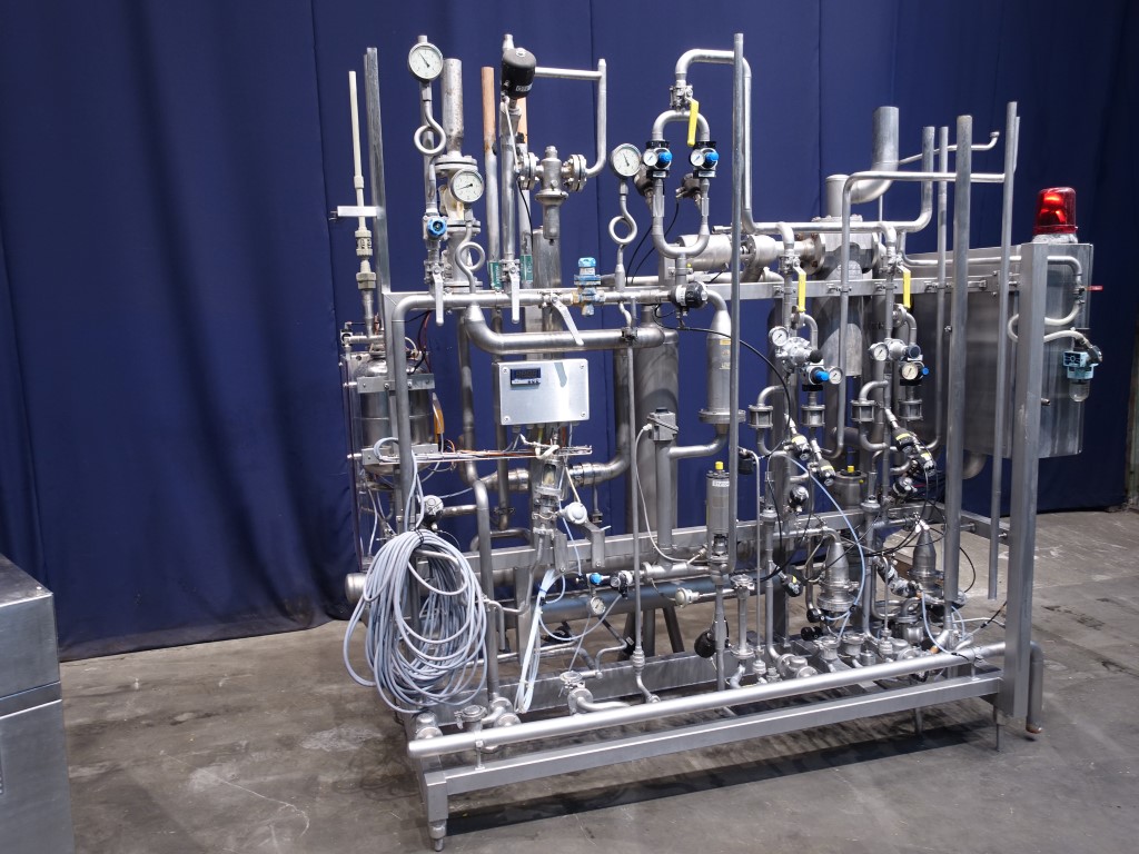 Sterile air treatment system. Originally used on a aseptic machine can be used to blow sterile air of which the temperature can be controlled for instance for filling machines or set of tanks. The unit is existing out of frame with 2 blowers (Wittig DST 140, 112 m3/h, 7,5 kW each) placed in a sound proof box. A separate skid with a stainless steel filter (steamable), injection of peroxide and desinfectant by dosing pump into the air and tubular heat exchanger for cooling the air with ice water. Including all interconnecting piping and valves, controls (Siemens S5 PLC, to be replaced). Total outside dimensions: 1,3 x 2,7 x 2,5 and 1,3 x 1,3 x 1,8 mtr.