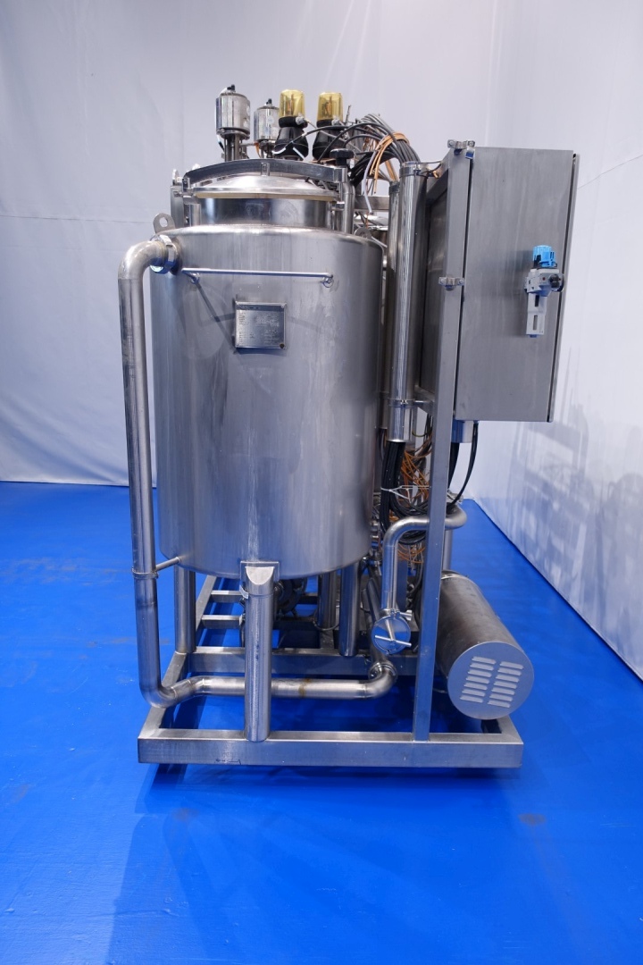 Skid mounted double Cip unit, 2 independent CIP units mounted in 1 frame. Each unit exists of: balance vessel 500ltr, Fristam centrifugal pump CIP + pump, Filter and a Plate heat exchanger. Pump details: Fristam type: FP742 A - no. 0443440080 motor: ABM 5,5 kW - 12 A - 2.890 rpm - 50 Hz - impellor Ø 175 mm - connections in: 2,5" Din - out: 2" Din. Pump 2 identical only no. 2 0443440081 and motor: 5,5 kW - 10,3 A - 2.930 rpm both giving 25-50m3/h at >4bar - connections in: 3" Din - out: 2" Din. 2x GEA plate heat exchanger to heat the cleaning detergent to the set temperature. Both type: VT20CDS-C-10 - no.: 170/13975 and 170/13976 - 1 section 22 plates. 11x pipes at the side of skid with connections 2" Flange. Controls: Siemens remote I-O box. Complete with piping for condensate and cip + return valves, 2 small vats connected to the vat for enzymes adding. The units were used to clean Quark separatores KDA30 and KDB45 (only steam control valves missing). Total dimensions: 285x135x235 (lxwxh) cm - weight: 1.415 kg's.