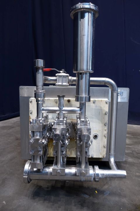 High pressure pump used for margarine emulsion. 2 Pistons have a overpressure valve and are manuel adjustable. Maximum pressure: 50 bar, temperature 100 °C. Motor: 22 kW - 38,8 A, Fored air cooling on motor. With bypass pipe and inlet filter. Stainless steel cladded with oil-level sightglass indicator. Connections: 1 x 1,5" Tryclamp, 1 x pipe Ø 51mm and 1 x Ø 57 mm. Excluded controls and documentation. Total dimensions: 210 x 100 x 125 cm.