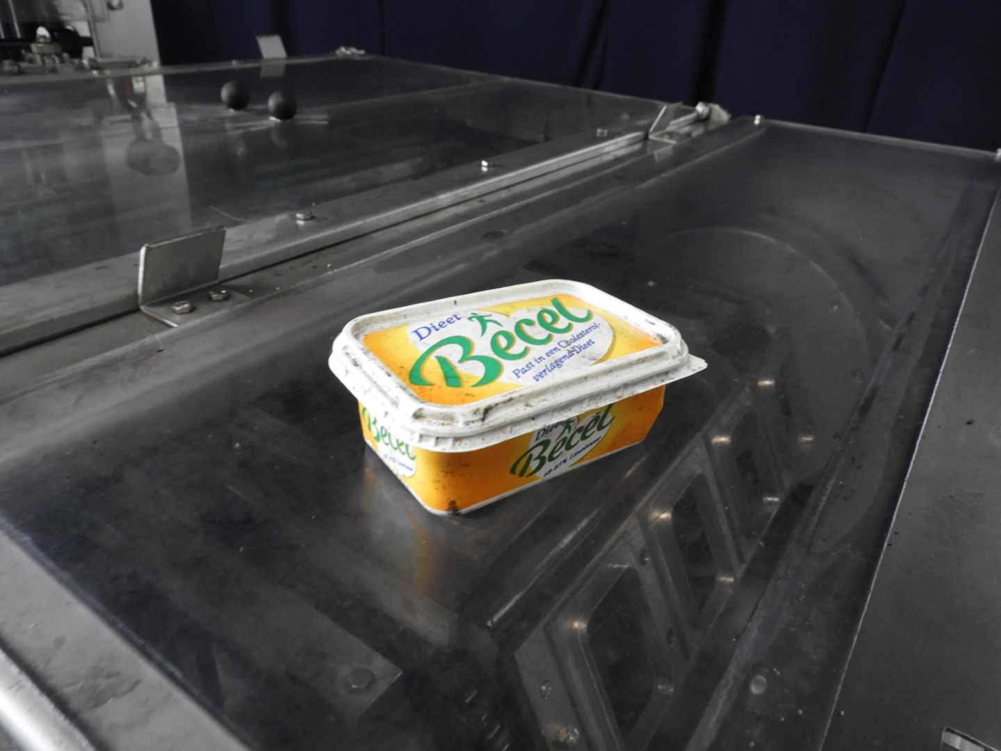 4 Lane liniair cup filler with 4 filling heads for margarine/halvarine/butter. Cups are in the machine in length direction. Stations: cup destacking with automatic cup feed system, no- and double cup detection, main doser (200-300 ml) for margarine / halvarine products with direct connection, interleave dispending by vacuum (preformed interleave papers), after pushing station, snap-on lid with automatic lid feed system and outfeed by double lane perpendicular on the machine without conveyor. Machine has plexiglas safety guards and has a central greasing system. Excluding control panel. No documentation available.