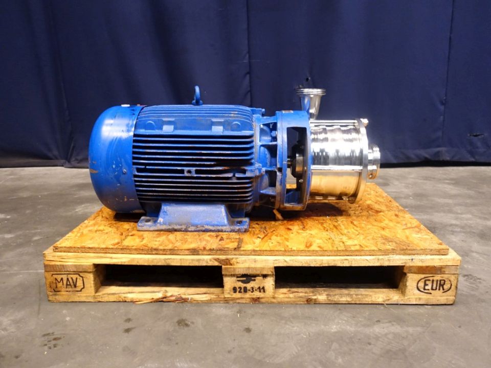 Sanitary centrifugal pump. Current motor: 30 kW - 55 A - 2900 rpm. 3 Stages. High pressure. Impellor diameter: 180 mm. Flushed seal. Connections: DN100 / DN80, DIN.