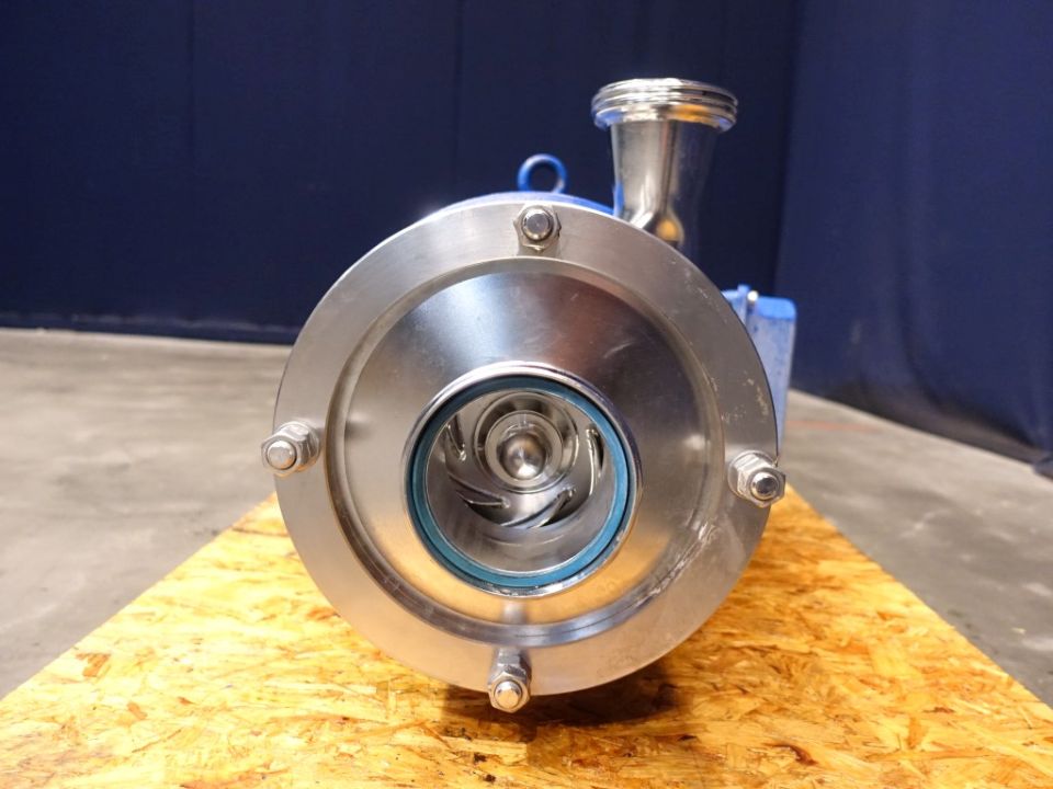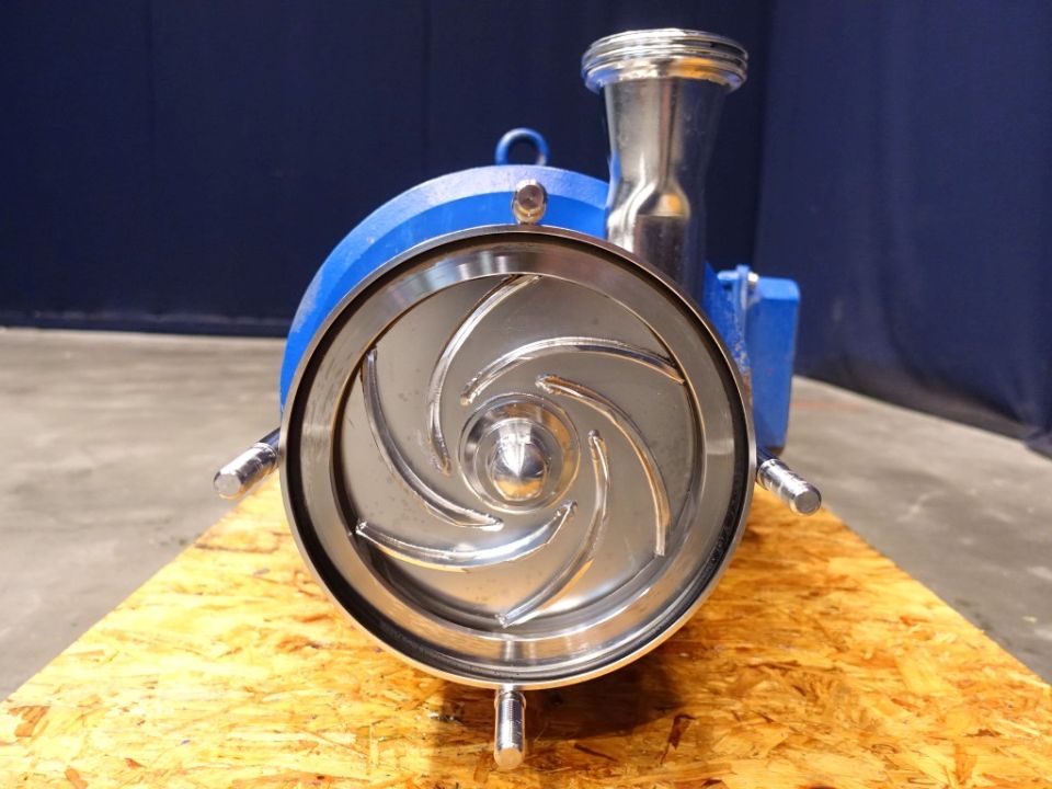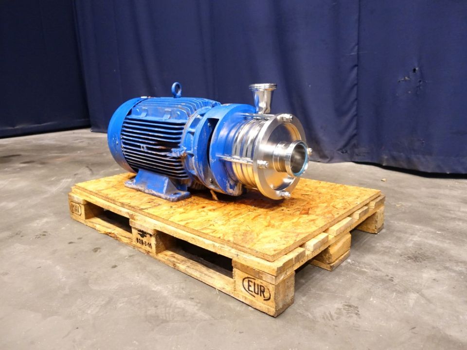 Sanitary centrifugal pump. Current motor: 30 kW - 55 A - 2900 rpm. 3 Stages. High pressure. Impellor diameter: 180 mm. Flushed seal. Connections: DN100 / DN80, DIN.