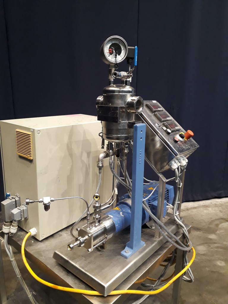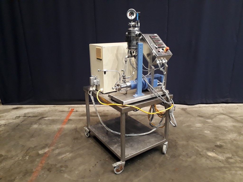 Mobile Laboratory Dispax Reactor (DRL 3/5/246 D) which is a three-stage high shear inline dispersing machine used for the laboratory tests of very fine emulisions and suspensions. Motor: 0,3/1,0 kW - 8/11,5 A - 1200/2520 rpm. 25-50 Hz. Air pressure seal tank (Aerni ARK139, 1997, 5449/3, pressure 25 bar, temperature 200 °C, volume 2,5 liter). Including control panel with temperature, speed and amperage/current readout. Frequenc converter on motor, electric scheme. Total dimensions: 110 x 110 x 185 cm.