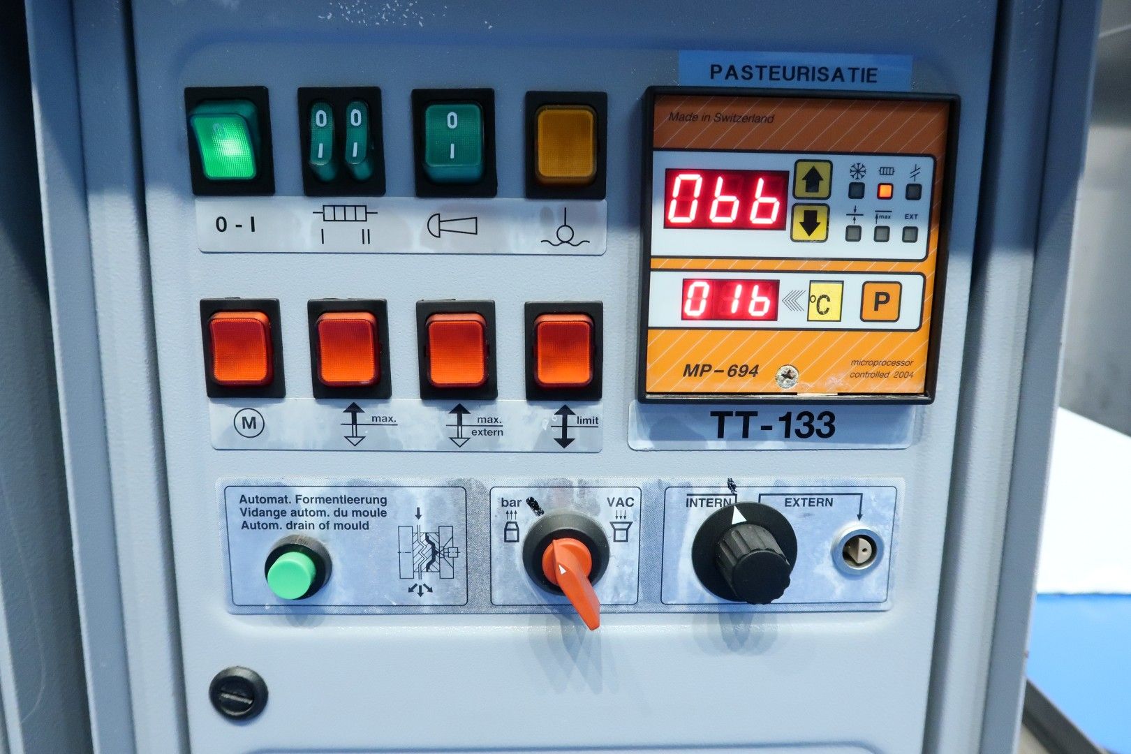 Double bioreactor. Used for fungal applications. Condition: very good. Vessel woking volume 2 x 20 ltr. - jacket 2,0 ltr. - Total volume 2 x 30 ltr. With i.a. following systems/sensors: Air/N2 gas system - Co2 gas system - temperature sensor in vessel and jacket - pressure sensor in lid - both vessels with oval sight glass - both vessels with internal lamp - both vessels with U-shaped agitator (speed frequency controlled servomotor). Material SS 316 (1.4404) and 304L (1.4307). With 2 x Tool-Temp AG, TT-133 pre-heater (water bath) system. Power 2x 13,9 kW. Controls bioreactor: Siemens/Infors with 2 x HMI touch screen. Dimensions bioreactor: 180x100x177 (lxwxh) cm - weight: 237 kg. Dimensions pre-heater: 105x100x132 (lxwxh) cm - weight: 225 kg.