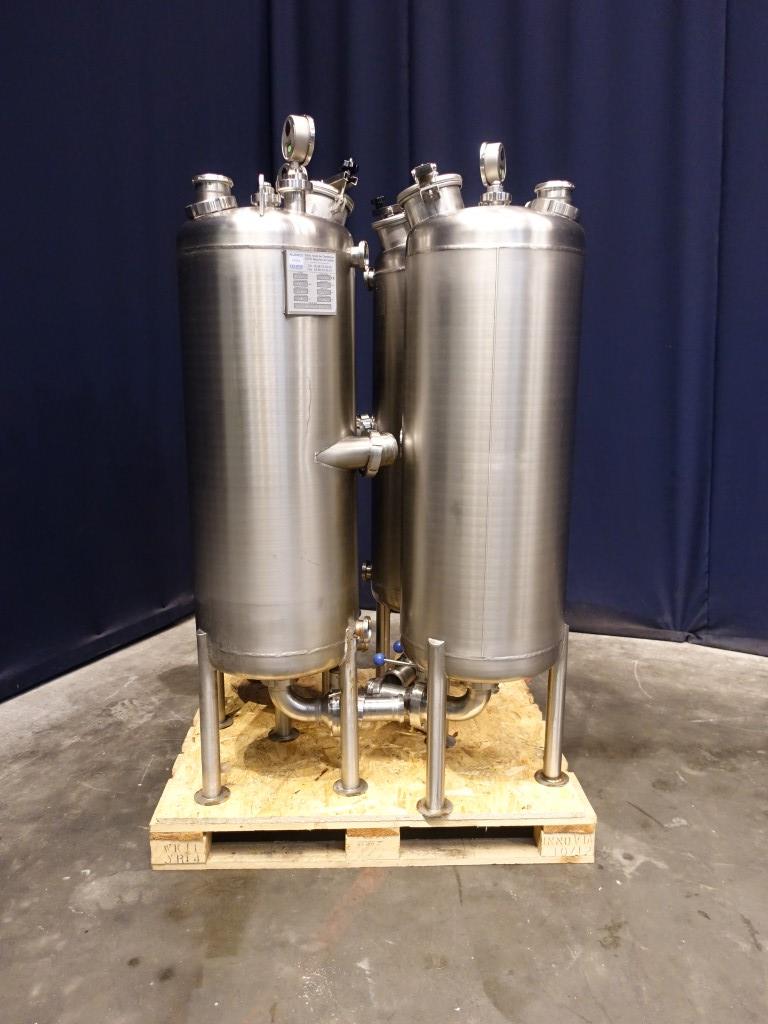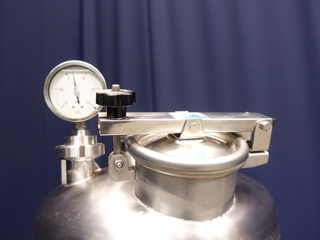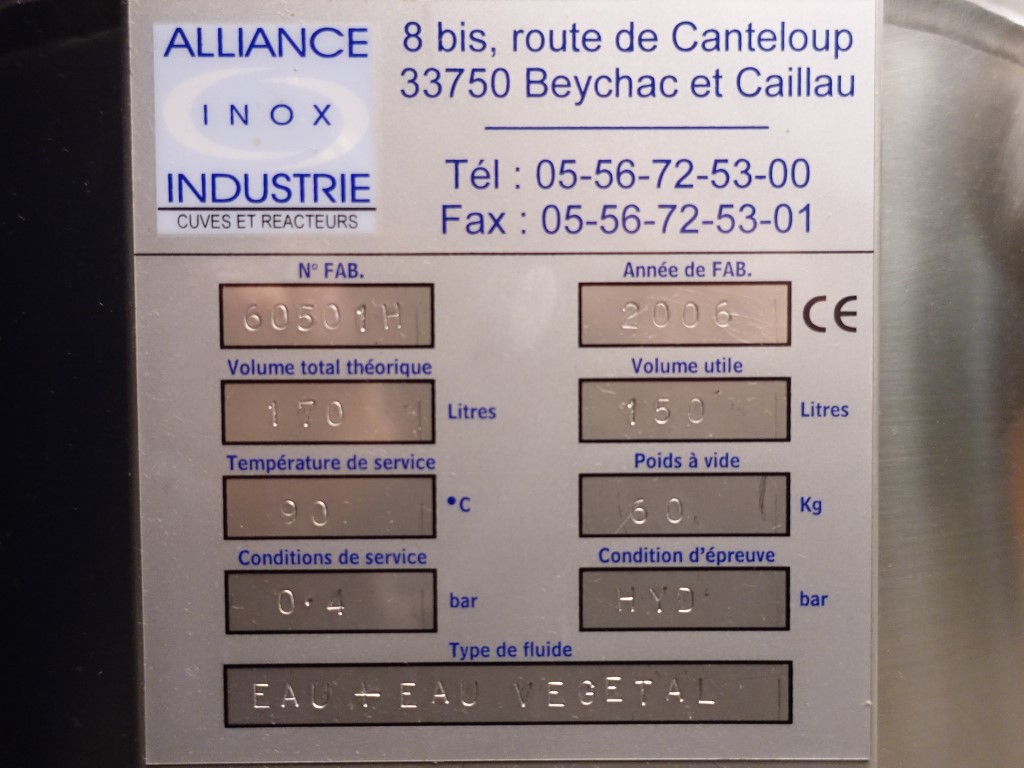 Single jacketed tank, volume 170 liter. Year: 2005. Connections: 1x 2'' SMS, 2x 2,5'' SMS, 1x 1'' SMS + spray bowl + 1x 3'' SMS. Manhole. Pressure manometer.