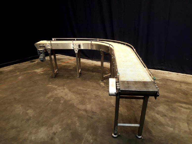 Chain conveyor with 1x 90° corner. Effective belt: 485 x 40 cm. Motor: 0,37 kW - 23 rpm. Horizontal. Total dimensions: 500 x 70 x 110 cm.