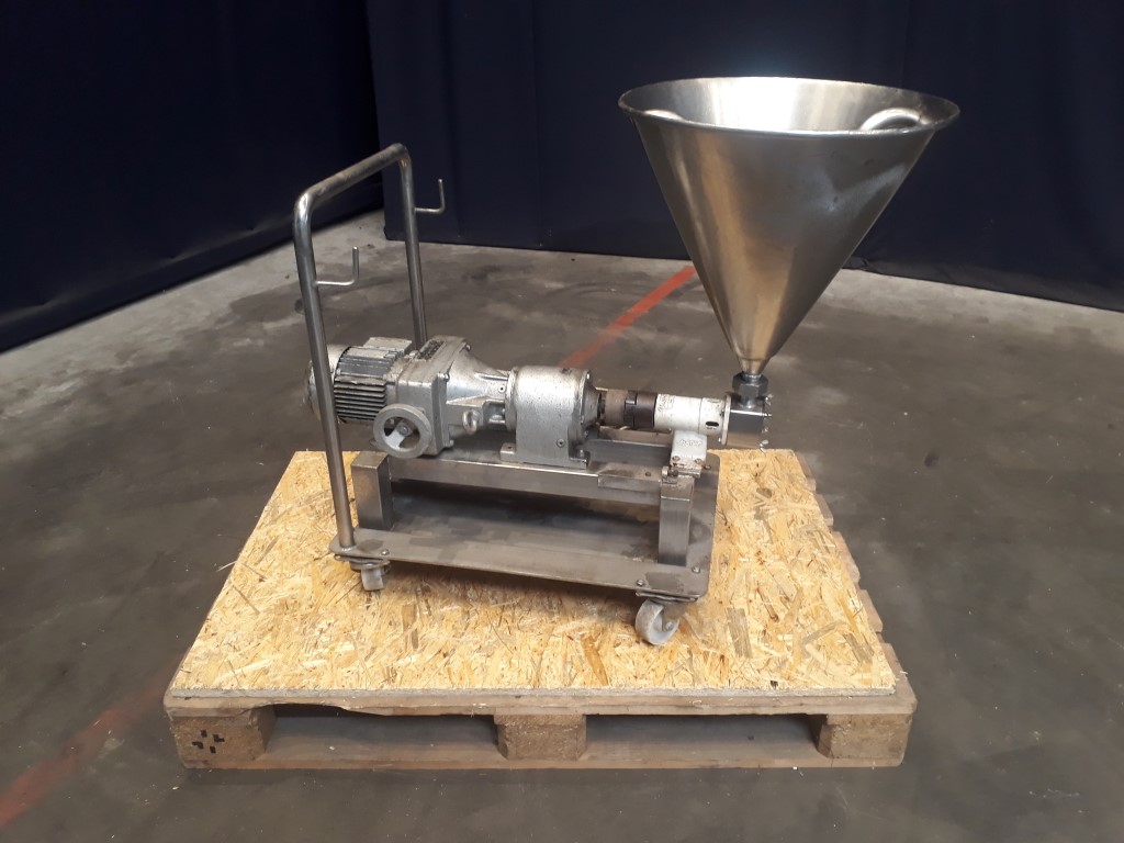 Hygienic Stainless Steel Pedestal Pump. Self-priming from dry up to 5 mtr. Pressure up to 4 bar. On a mobile frame. Gummy impellors. CIP Cleanable. Current motor: 0,37 kW. Mechanical variator. Connections: 1''/1'', ISS. Including stainless steel hopper of ± 25 ltr.