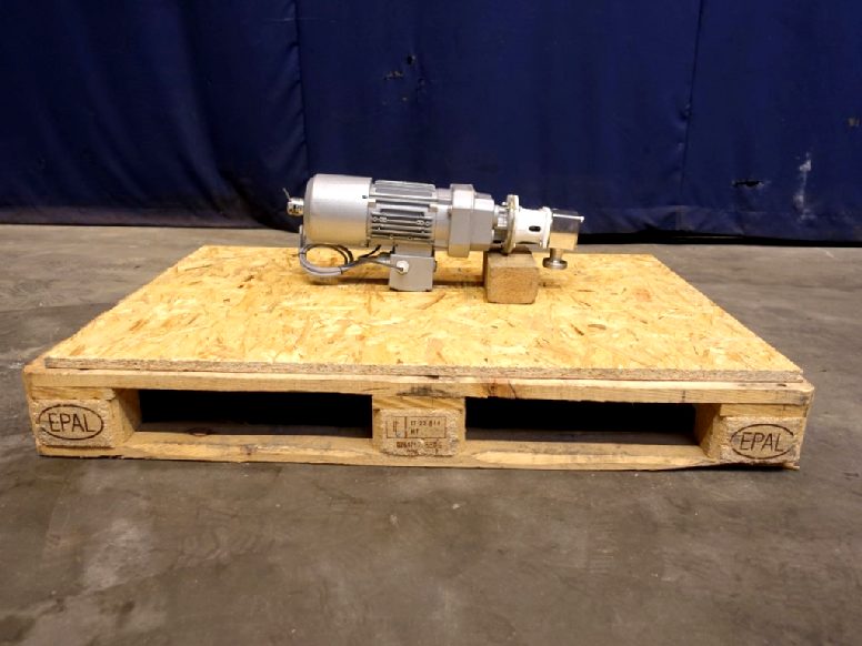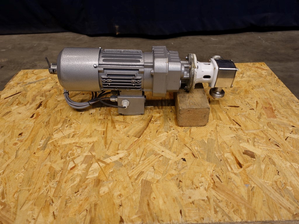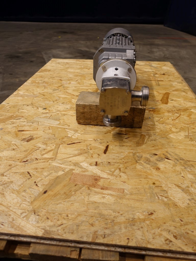 Pureflo' Hygienic Self-Priming Flexible Impeller Pump. Current motor: 0,55 kW - 1,54 A - 244 rpm. Impellor diameter: 65 mm. Up to 330 litres/minute at 3m head @ 1500 rpm. Max. differential pressure 1 bar. Connections: DN25 / DN25, DIN.