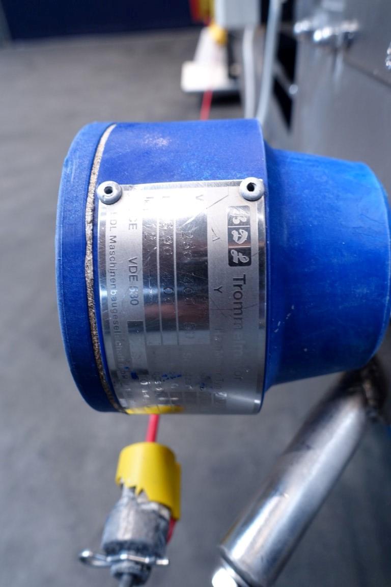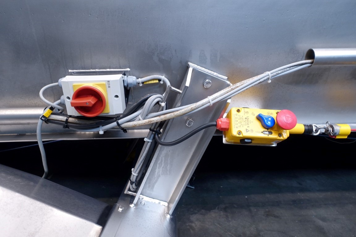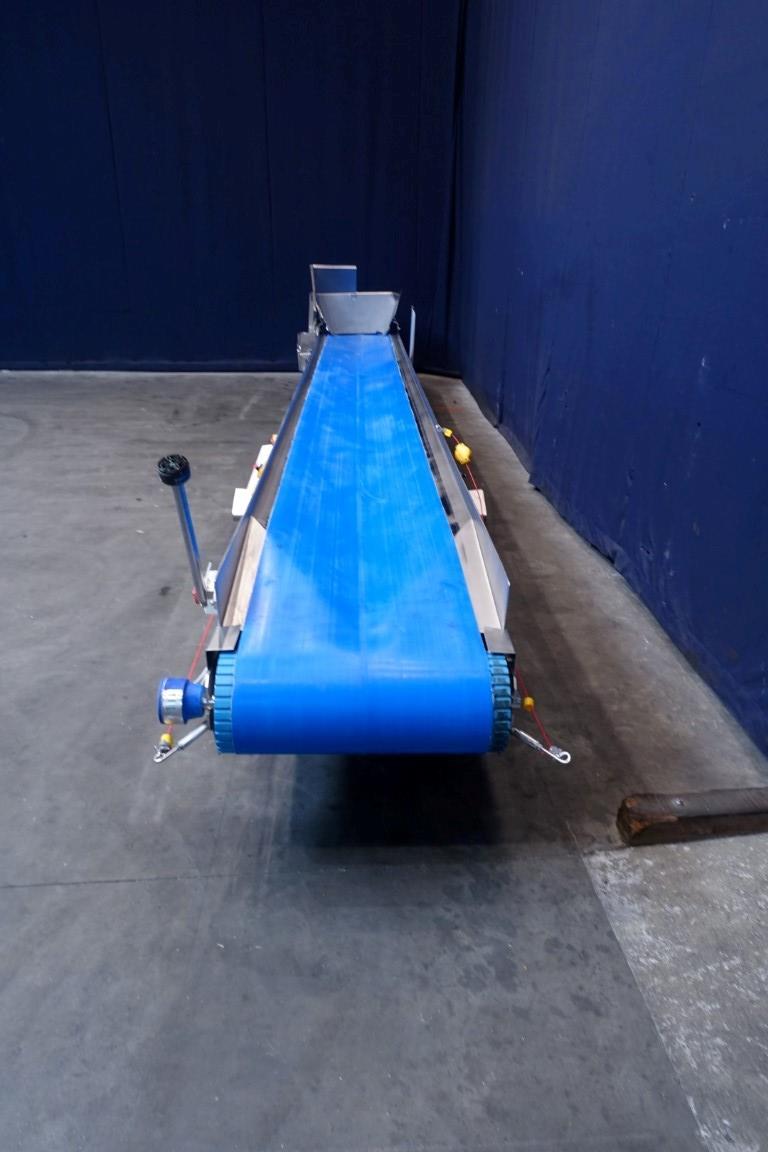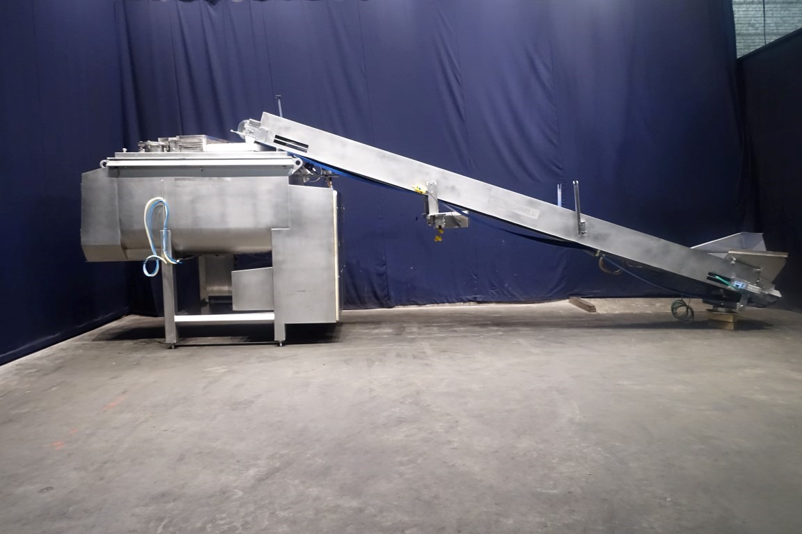 Belt conveyor. Effective belt dimensions: 660 x 56 cm. Drum motor: 1,5 kW. Belt under angle going up. Total dimensions: 670 x 120 x 100 cm. Weight: 670 kg. Will be sold together with STN11950 (Ribbon blender). Last photo is of both together.