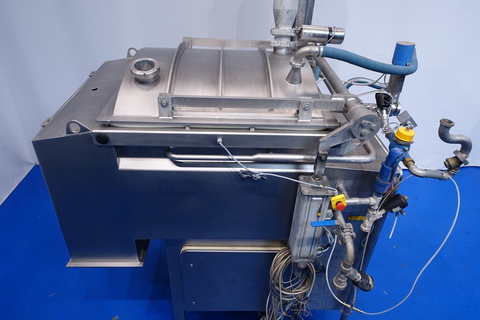 Vacuum Cooker melter, Ribbon Blender, horizontal. Double jacketed for indirect heating or cooling and Direct heating by steam injection, 6 x steam injection ports. Max pressure in jacket 2bar water or steam max 3,5 bar, CIP cleanable by 4 x spray bowls. 2 x Motor for ribbons 2x11kw motor. 1 Outlet hatche pneumatic openable. With vacuum system, Water dosing system with flowtransmitter . Closed cover, pneumatic liftable. Ingredient inlets: manual via bins. integrated liquid ring vacuum pump. Separate elevator, lifting bin arm for standard 200ltr trolleys (KS type 602, 1,1kW - max 250 kg). Control panel with PLC (Siemens S7-300 controls), Freq converters. Display operation panel. Dimensions product room: 100x100x82 (lxwxh) cm. Documentation available. Total dimensions 210x190x323 cm.