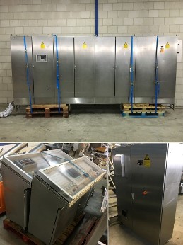 4x Stainless steel control panels. 1x Control panel with 8 doors. 2x Lessenaar model. 1x Control panel with 2 doors. Belongs to the complete cheese prepation line, STN11943 till STN11955.