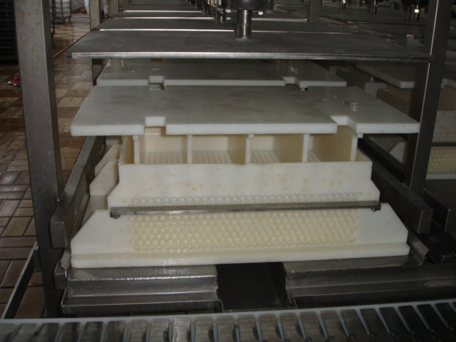Pawl conveyer press for cheese moulds consisting out of 2 rows of 40 cylinders each total 80 press places.1 cylinder 1 mould, With pneumatic infeed system and spray pipe for cip cleaning. Including 2 sets of micro perforated rectangular cheese moulds. First set of 100 moulds for standard ‘Euroblock’ format. Each cheese per mould 15 kg, size: 50x30x20 cm. Second set of 120 Multiforms. 5 rectangular "bread" cheeses per form, Each cheese 3-3.5kg. Size per cheese 25x12.5x±10-12c. Moulds have springs in cover for equal pressing. No controls. Total dimensions: 18.80 x 1.90 x 2.26 mtr.