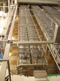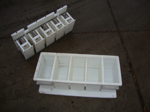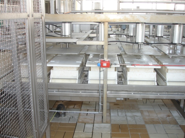Pawl conveyer press for cheese moulds consisting out of 2 rows of 40 cylinders each total 80 press places.1 cylinder 1 mould, With pneumatic infeed system and spray pipe for cip cleaning. Including 2 sets of micro perforated rectangular cheese moulds. First set of 100 moulds for standard ‘Euroblock’ format. Each cheese per mould 15 kg, size: 50x30x20 cm. Second set of 120 Multiforms. 5 rectangular "bread" cheeses per form, Each cheese 3-3.5kg. Size per cheese 25x12.5x±10-12c. Moulds have springs in cover for equal pressing. No controls. Total dimensions: 18.80 x 1.90 x 2.26 mtr.