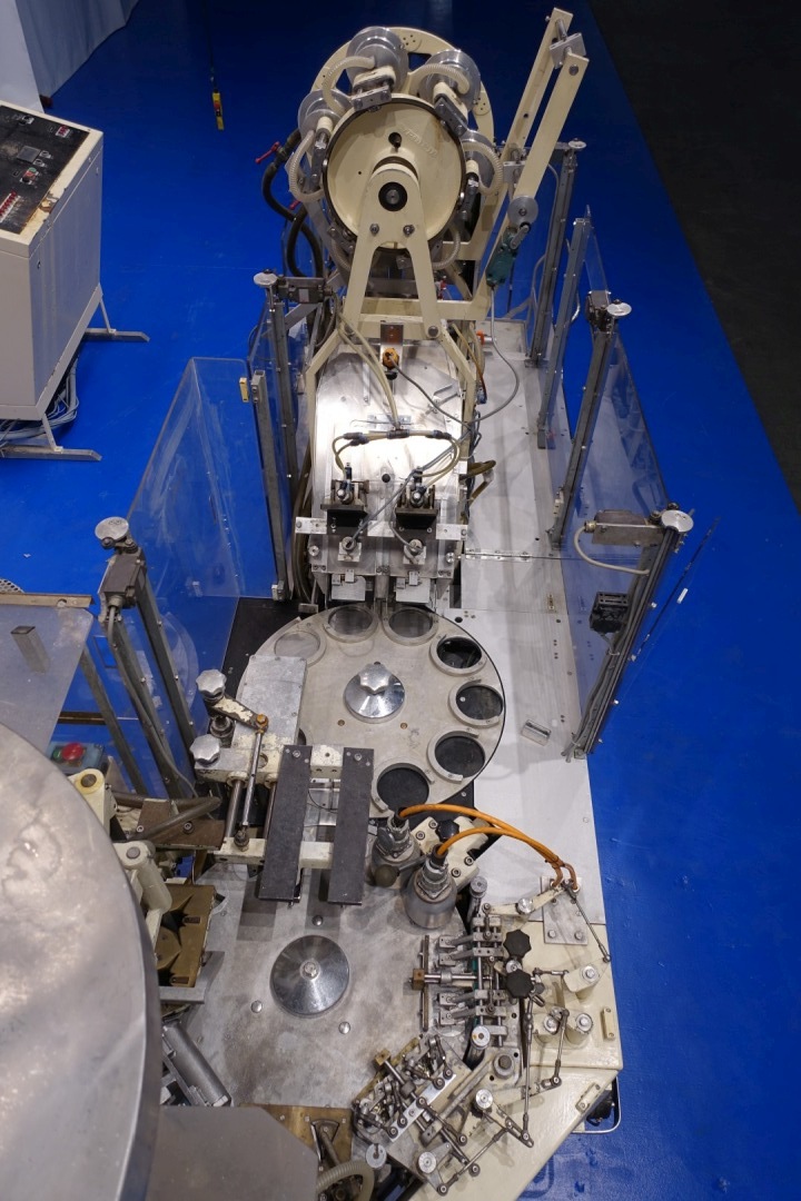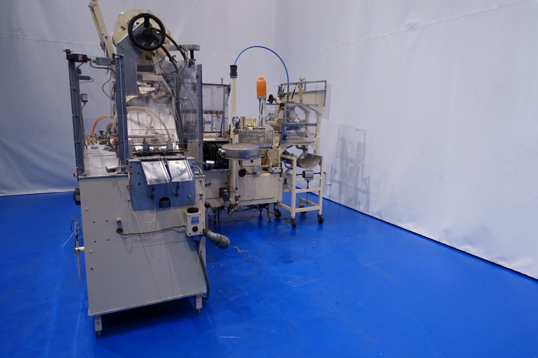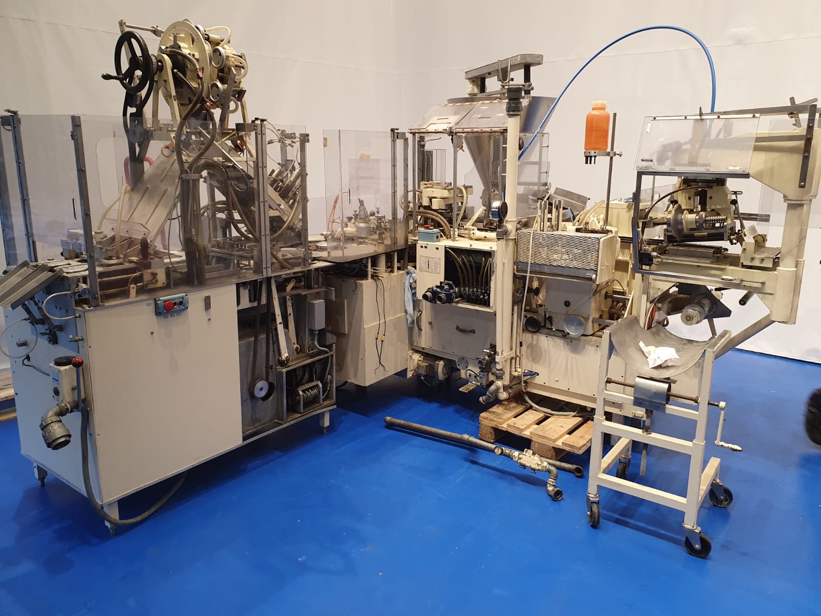 Filling, wrapping and labelling machine for triangle portions of processed cheese with automatic collecting/boxing into pre-formed carton boxes. The empty box with cover are fed in the top of the machine (no automatic infeed system of boxes). The machine opens the box, fills with the portions and closes the box. Filling machine is double head. Current format triangle portions, 17,5 and 25gram. Cluster: 8/8, Ø 109 mm, 140 /200 gram per cluster. Single strip easy opening system (tear cell / Tircel) for inserting of red tape into a packed portion for easy opening of the portion. Capacity: 240 portions per minute. Double jacketed hopper of ± 100 liter with agitator. Product consistency warm, semi-liquid, filling temperature 75-90 °C. Label application with cold glue tank. Including control panel. Casing by doors with stainless steel frame and polycarbonate windows. Total dimensions: ca. 350x300x220 (lxwxh) cm - weight: +/- 2.700 kg. Currently without box infeed system.