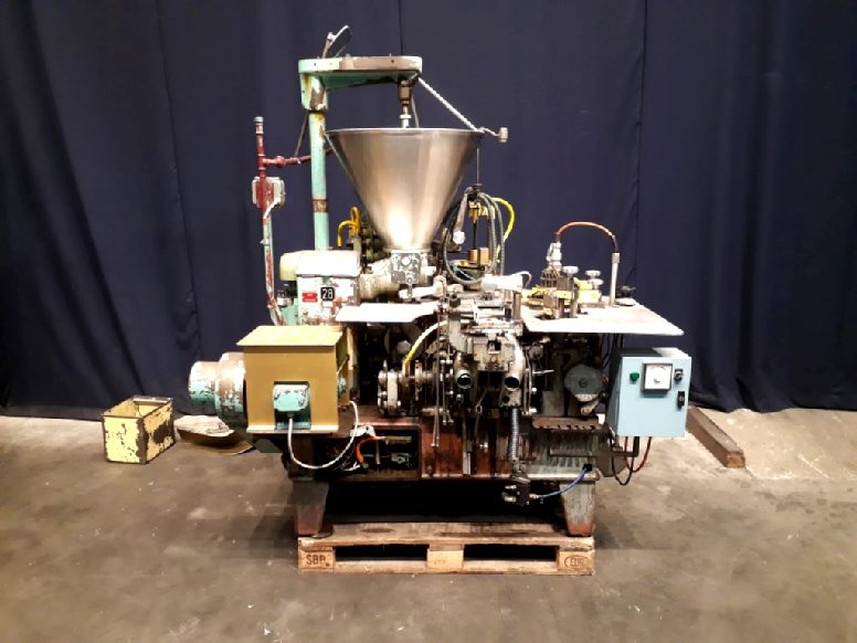 Automatic filling and wrapping machine for processed cheese or cream cheese. Liquid hot fill. 10 Step turn table.Current format: 50 gram, round 68 mm, height adjustable. Feeding by hopper with agitator. Bottom foil forming, filling with cut off valve, top foil cutting and placing on product, heat sealing and outfeed arm. Control panel. Incomplete unroaling device topfoil and dosing piston. Excluding outfeed conveyor. Total dimensions: 160 x 200 x 230 cm.