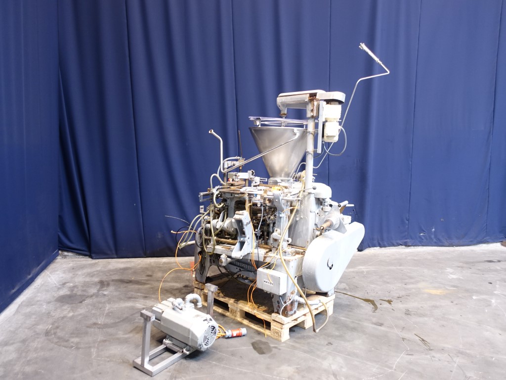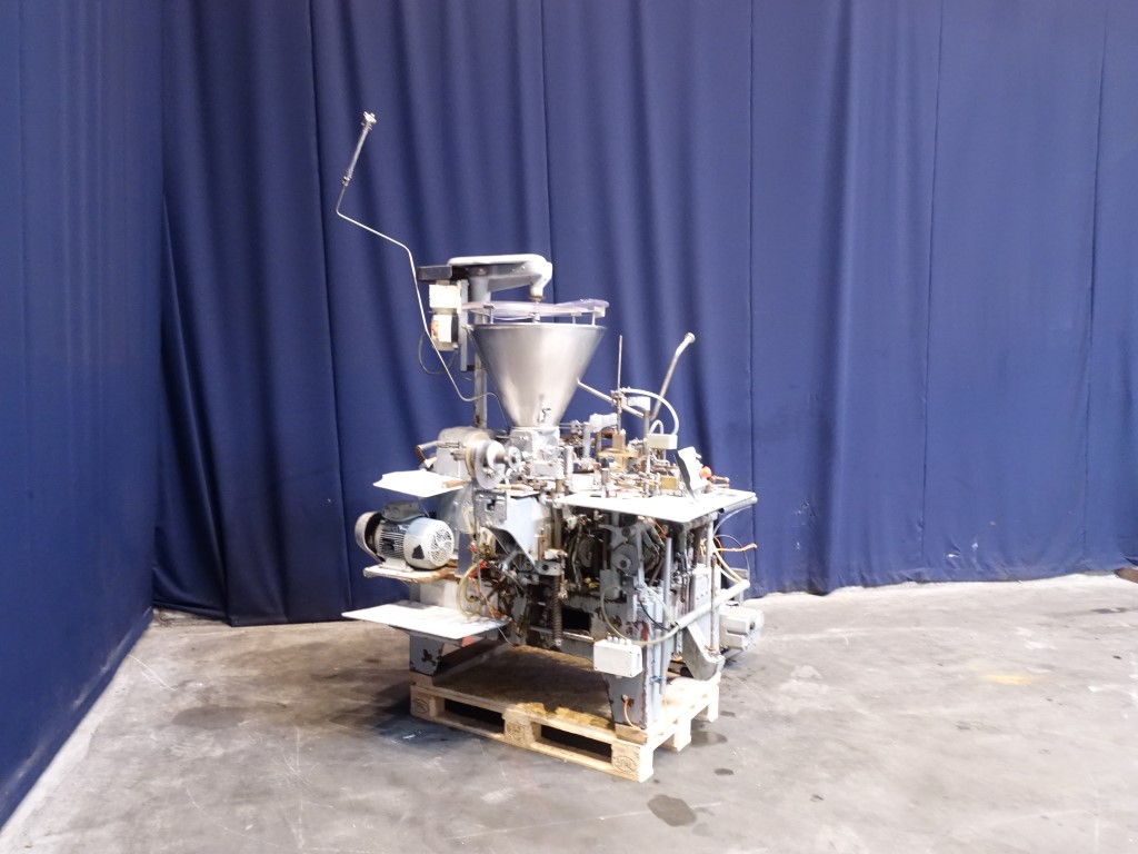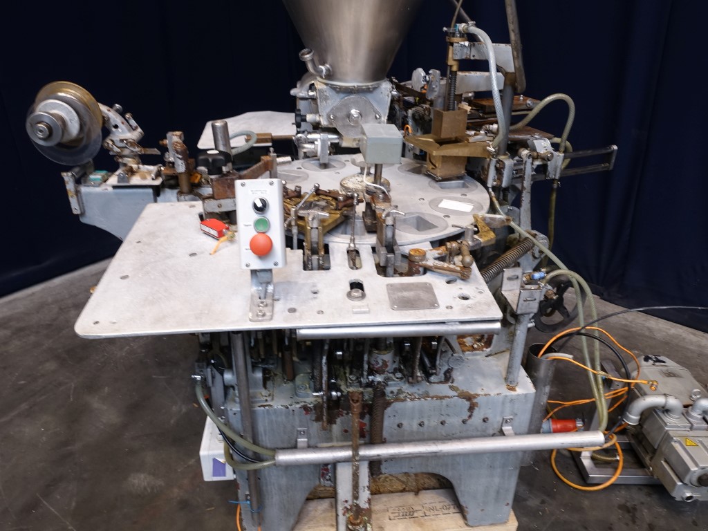 Automatic filling and wrapping machine for processed cheese or cream cheese. Liquid hot fill. 10 Step turn table. Current format: 100 gram, ± 50 x 80 x 26 mm. Feeding by double jacketed hopper with agitator. Bottom foil forming, filling, top foil cutting and placing on product, heat sealing and outfeed arm to conveyor. STN14385 + STN14386 have been running together in the same factory. The parts which are for both machines (control panel, conveyors etc) will be sold with STN14385. Total dimensions Kustner: 240 x 320 x 250 cm. Has been running together with STN14385, STN14387 and STN14388.