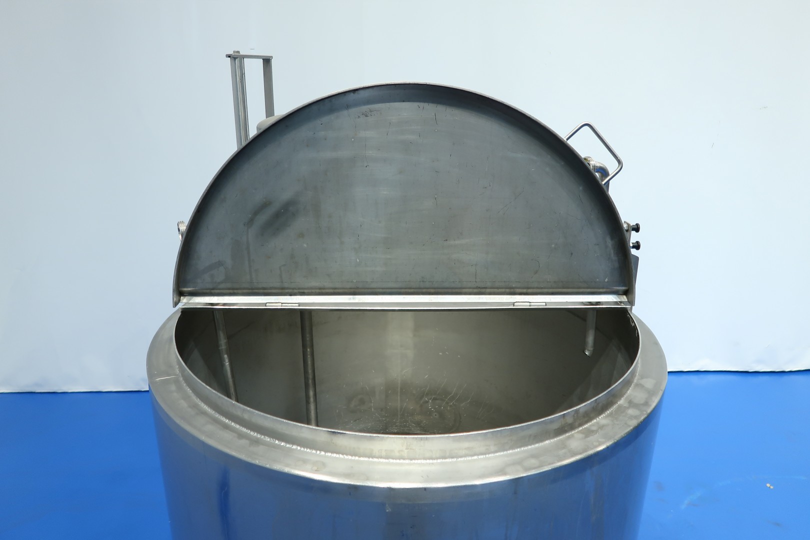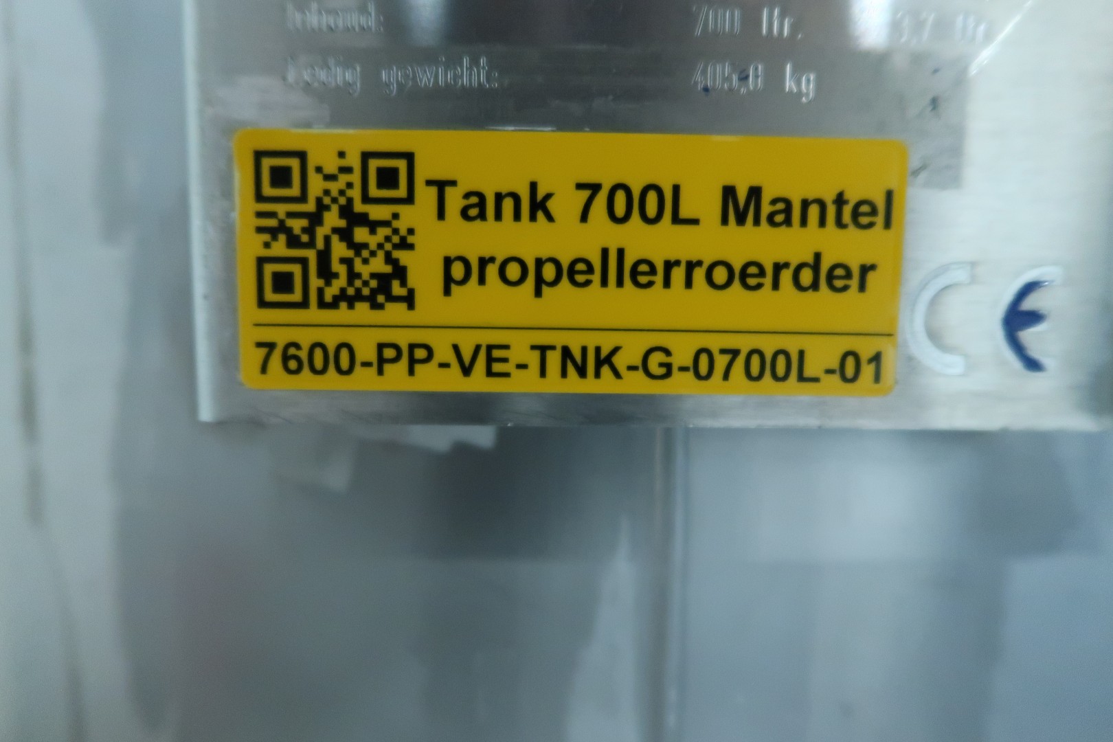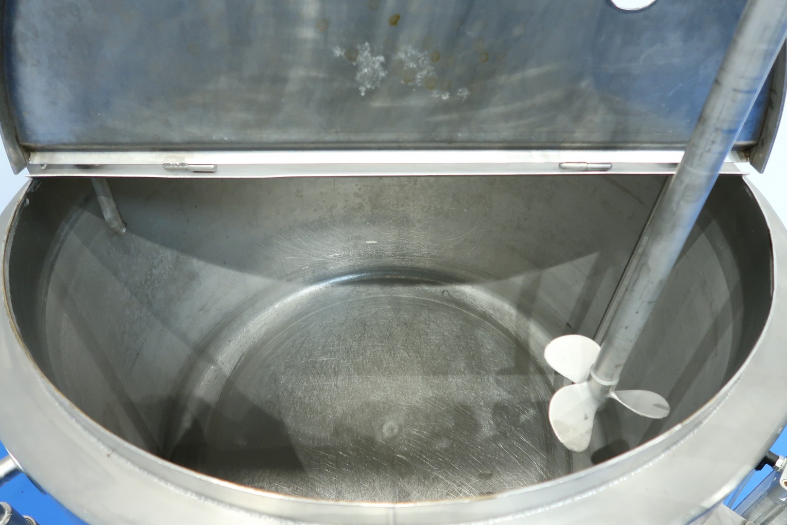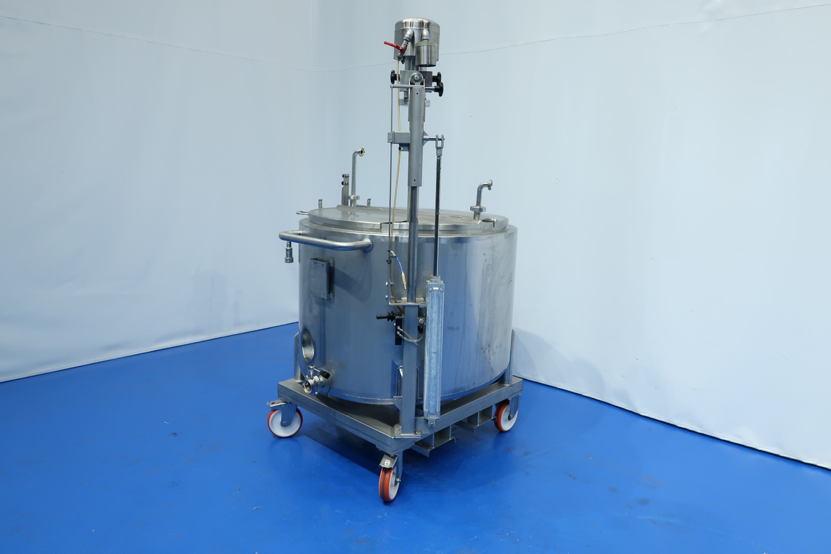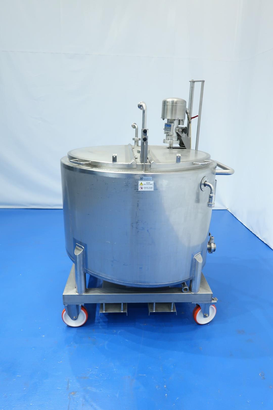 Double jacketed mix/process tank on mobile SS frame. Top side driven propellor agitator with lifting option. Pressure in double jacket 5 bar and Volume 3,7 ltr/ 160 °C. Complete agitator can be lifted via an air cilinder. Jongia TD 35-L agitator motor driven by compressed air. Manual speed variation by a ball valve. Outlet manual butterfly valve, connection 3" Din. Test video available. Total dimensions: 130x122x189 (lxwxh) cm - weight: 405 kg.