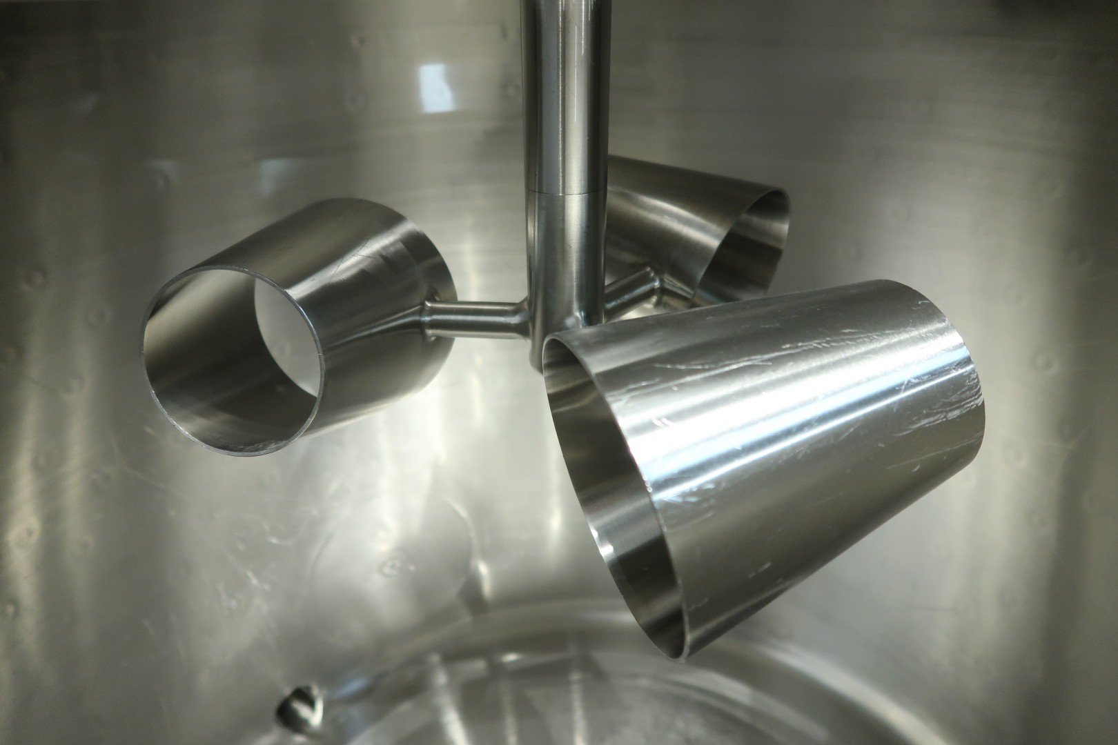Double jacketed process tank on mobile SS frame. Top side driven agitator with 'cup' stirrer. Pressure jacket: 5 bar and volume: 1ltr. temperature: 160 °C. Complete agitator can be lifted via an air cilinder. Agitator motor driven by compressed air variable speed by manual ball valve operation. Outlet manual butterfly valve, connection 3" Din. Test video available. Total dimensions: 100x95x206 (lxwxh) cm - weight: 330 kg.