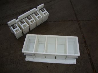 Multiforms 5 rectangular "bread" cheese per form, Size per cheese 25x12.5x±10-12cm for 3-3.5kg cheeses, micro perforated. Springs in cover for equal pressing. 130pieces available. These moulds can only be bought in combination with STN7338 cheese press of 80 cylinders.