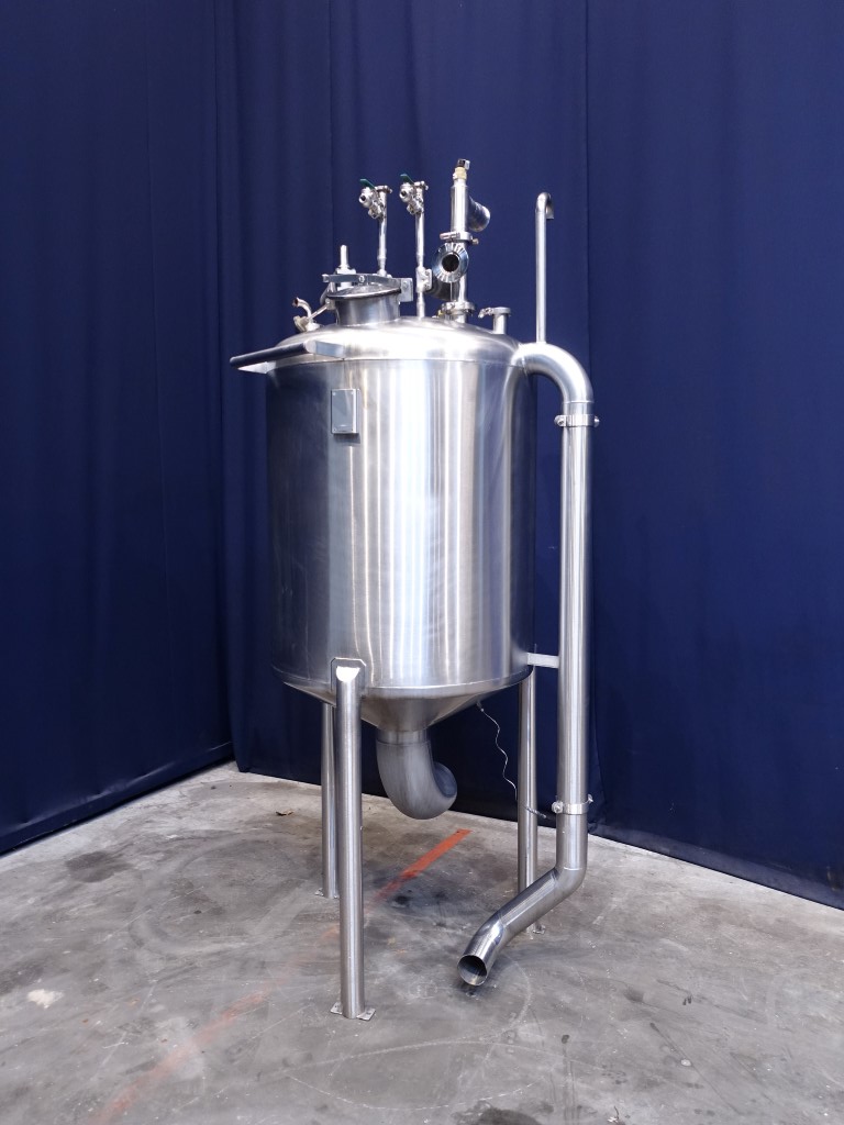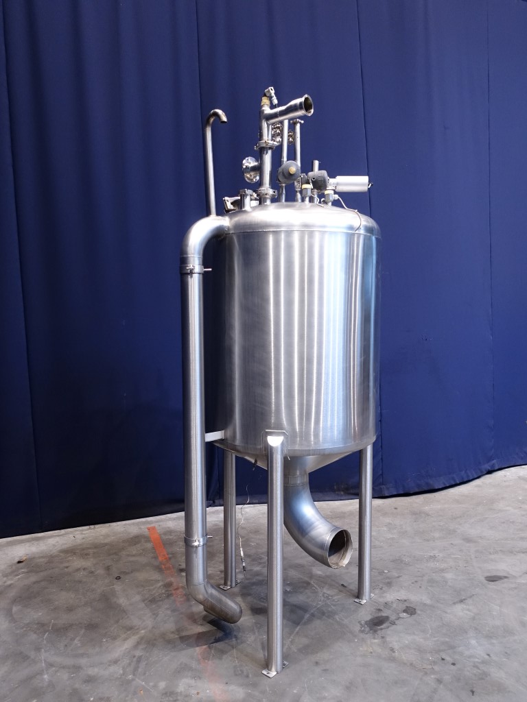 Vertical level tank. Pressure in tank atmospherique. Conical bottom. Product outlet 8'' and outlet height: 50 cm. Connections for: high and low level. Manhole in top, round, diameter 200 mm. 4'' Overflow tube. Breather. Several inlet connections on top. 3 Feet. Inside dimensions of tank: diameter 900 mm and height 1200 mm. Total dimensions: 120 x 110 x 300 cm.