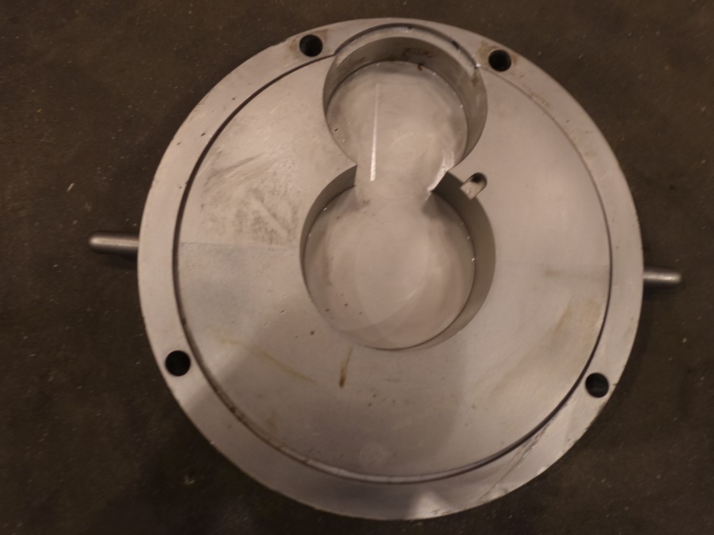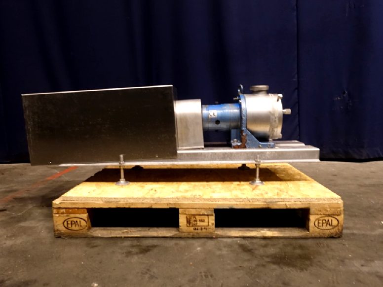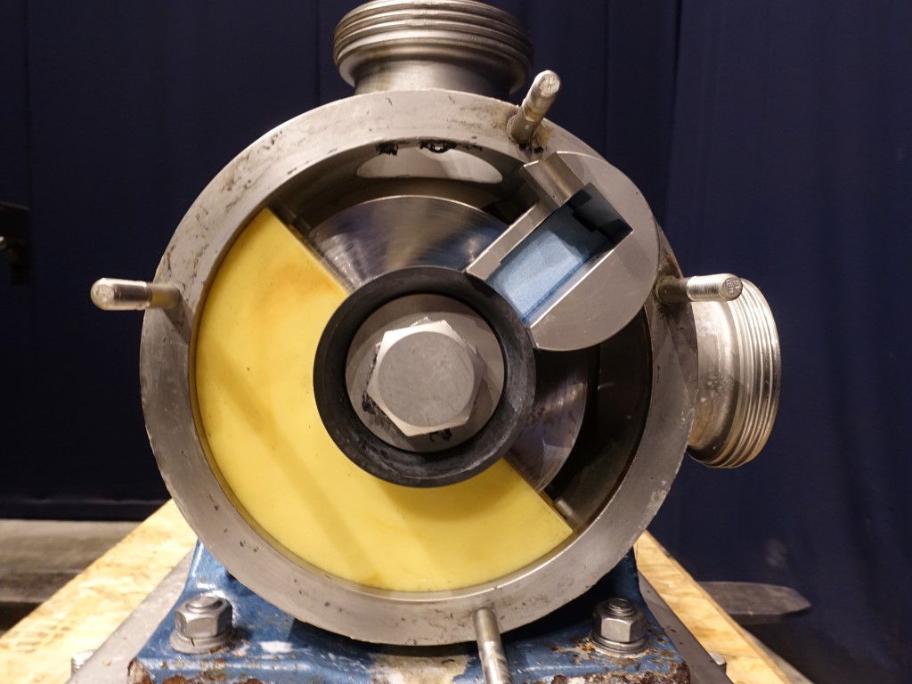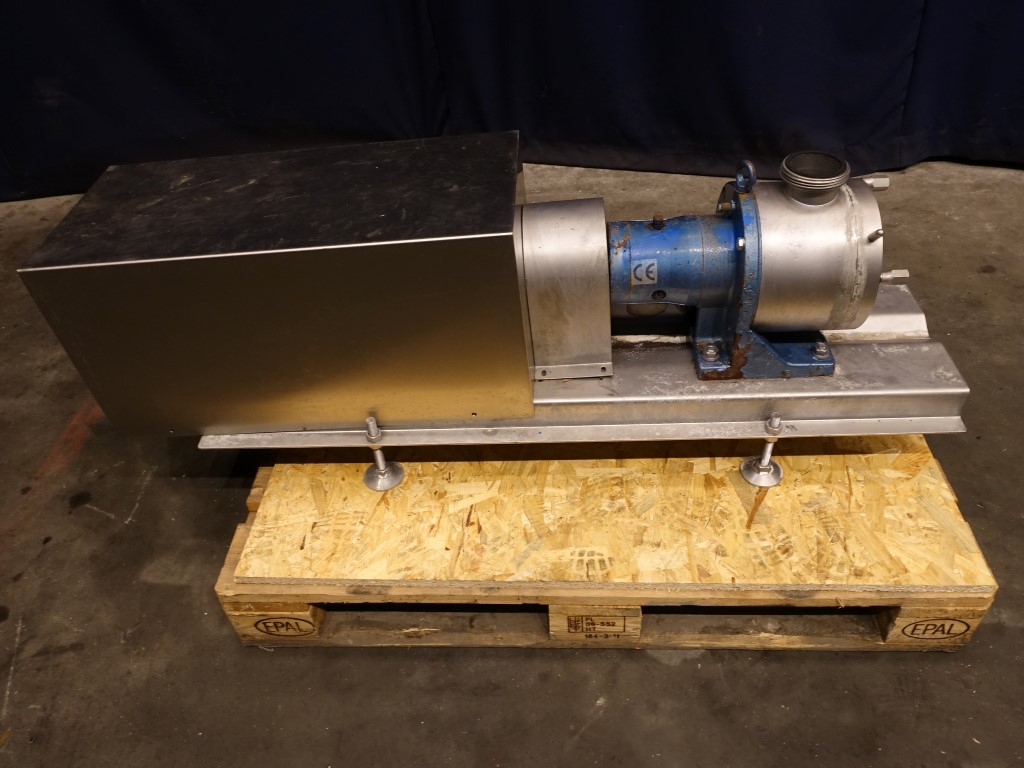 Sine shaped pump. Impellor diameter 160 mm. Displacement per revolution: 0,45 ltr. Maximum particle size: 19 mm. Maximum speed: 600 rpm. Current motor: 2,2 kW - 4,7 A - n1: 1410 rpm - i= 10,76 - n2: 131 rpm. Connections: DN100 / DN100, SMS.