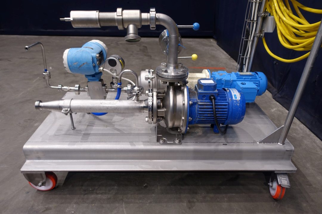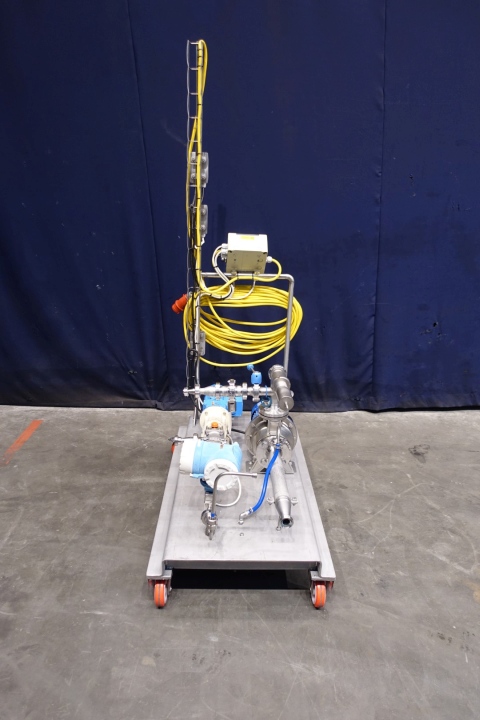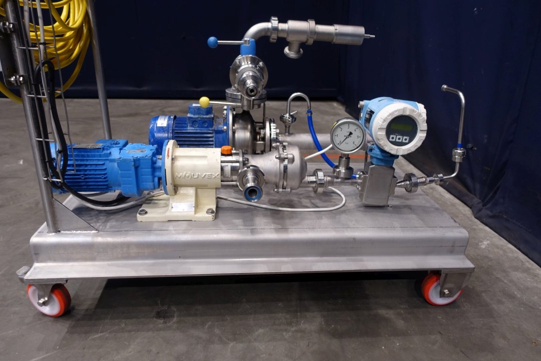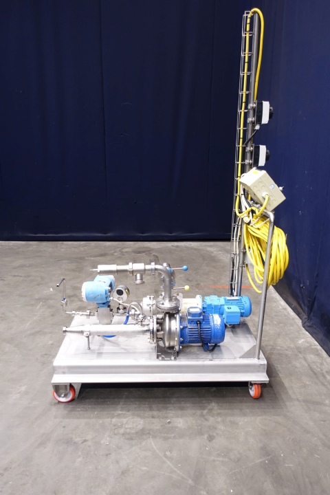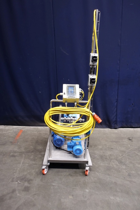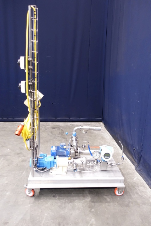 Yoghurt structuring pump unit. Mounted on mobile SS frame. With Mouvex eccentric disc pump for structuring, 1 x cip/cleaning centrifugal pump, 1 x pressure gauge and 1 x E&H (Promag H) flow transmitter. Simple on/of controls, speed variable. Motor (of Mouvex pump) 0,37 kW - 1,82 A - 230 V - 50 Hz - n1 1370 rpm - n2 271 rpm. Connections: 2 x 1" Din and 1 x 1,5" Din. Totale dimensions 125x70x215 (lxwxh) cm - weight 167 kg's.