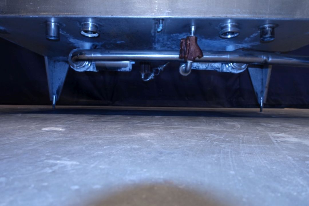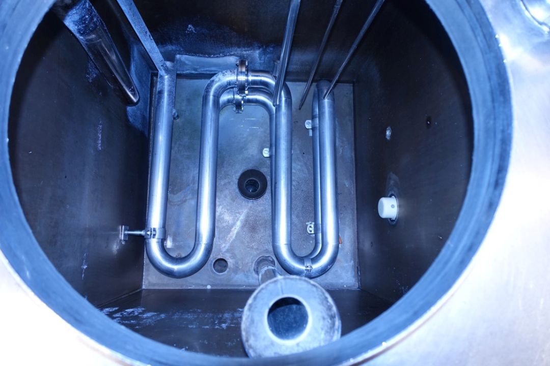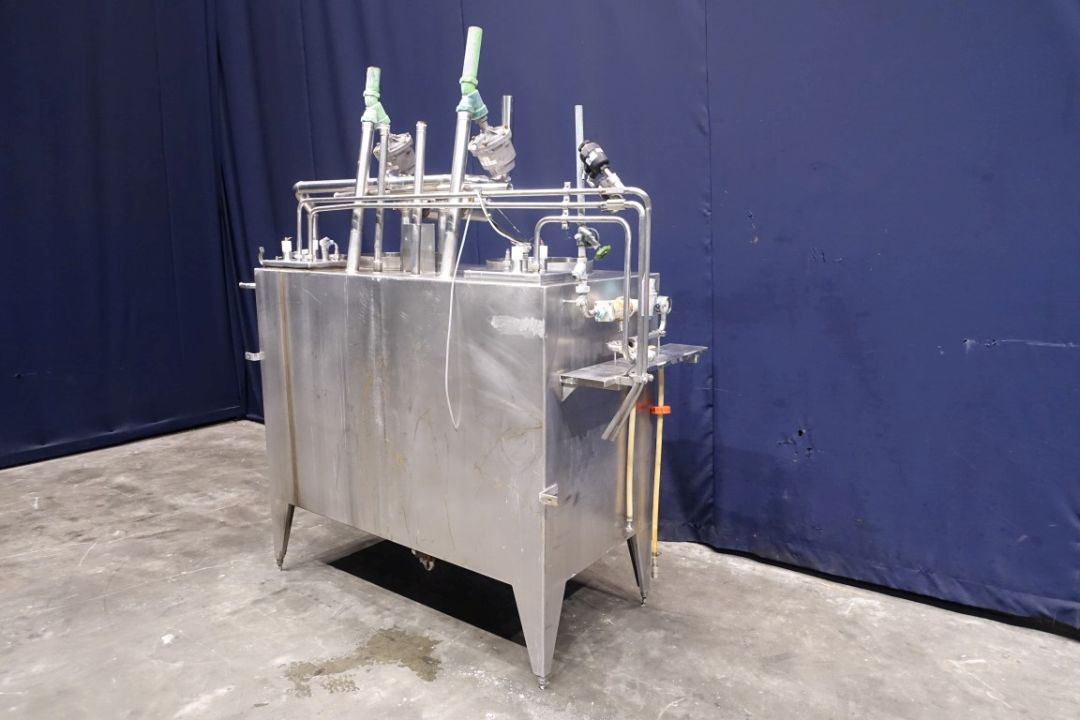 Multichamber tank. 1x Tank for water/desinfection. 1x Tank for lye or acid. Manhole in top, both tanks with spiral-Coil heatexchanger steam->product to heat the water or detergent by steam. Temperature and level sensors, steam valves and valves for cleaning detergents. Total dimensions: 250 x 80 x 220 cm.