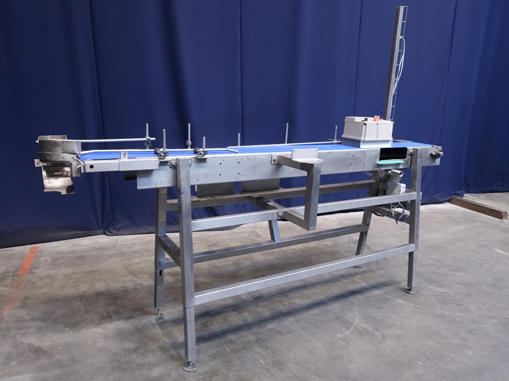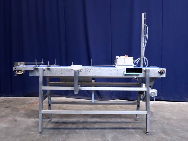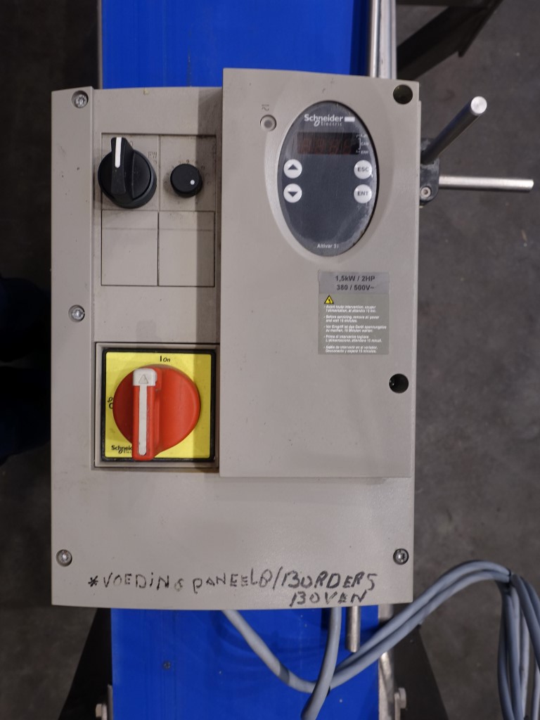 Belt conveyor with frequency convertor. Effective belt: 23 x 250 cm. Motor: 0,25 KW - n1: 1300 rpm - n2: 94 rpm. Horizontal. Total dimensions: 275 x 100 x 210 cm.