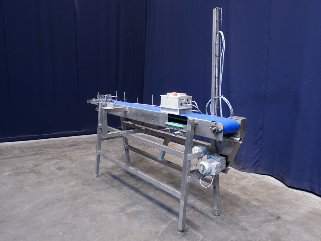 Belt conveyor with frequency convertor. Effective belt: 23 x 250 cm. Motor: 0,25 KW - n1: 1300 rpm - n2: 94 rpm. Horizontal. Total dimensions: 275 x 100 x 210 cm.