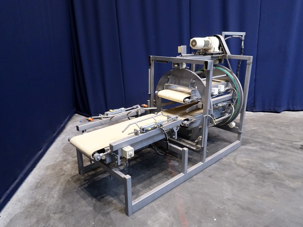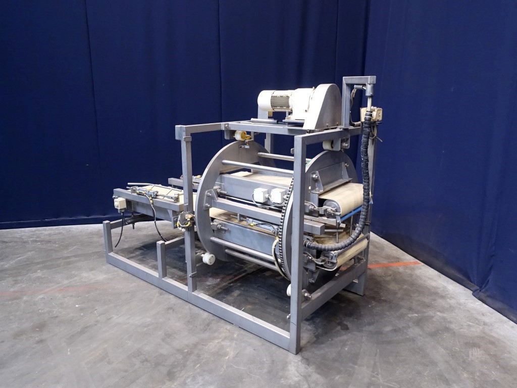 Cheese turning device, top and bottom conveyor, cheese comes in, devices turns 180 degree, conveyor moves the cheese out. Max cheese size: wide 31cm x height 20 cm. Conveyor size: 42 x 120 cm. Including infeed conveyor: 42 x 120 cm. Rotating: 180°. Motor: 0,75 kW - 2,2 A - 220 rpm. Total dimensions: 120 x 290 x 170 cm.
