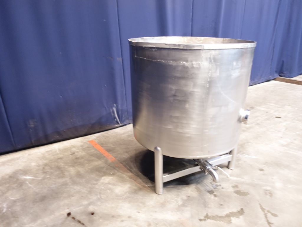 Level tank. Total open top. Conical bottom. Product outlet, 2'' with manual ball valve. Outlet height: 15 cm. 3 Feet. Inside dimensions of tank diameter 95 cm, height 85 cm. Total dimensions: 105 x 105 x 120 cm.