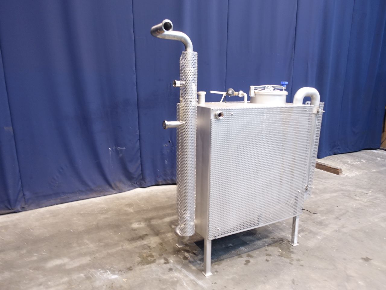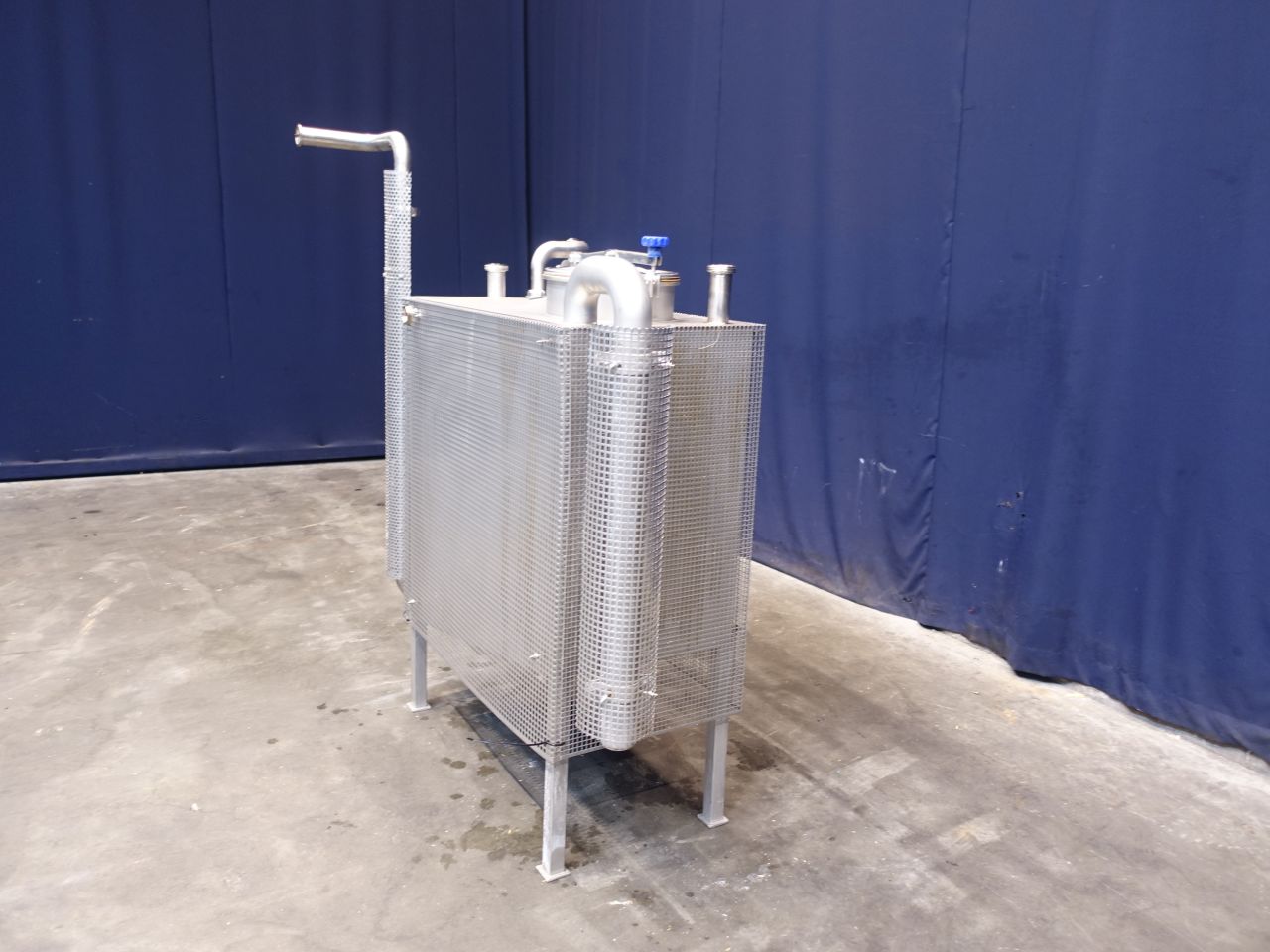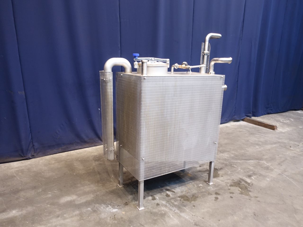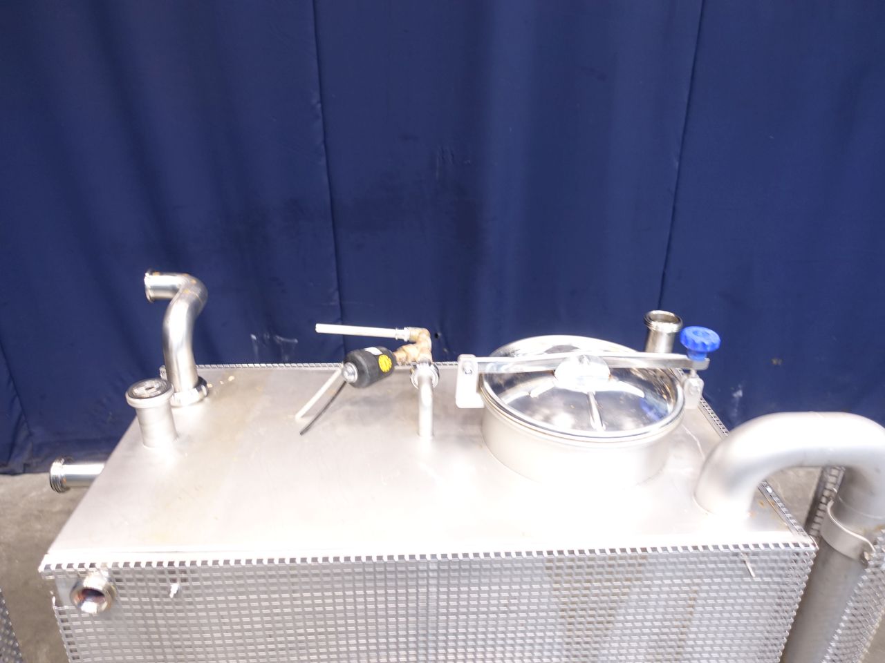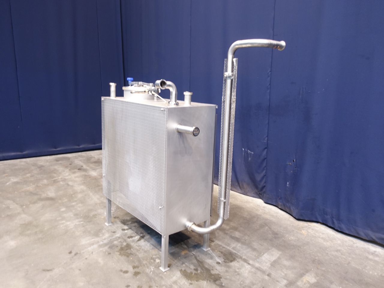 Rectangular level tank. Manhole in top. Flat to the side. Product outlet 2'' SMS. Outlet height: 30 cm. 1 CIP spray bowl. 4 Feet. Inside dimensions of tank 49 x 99 cm and height 79 up to 99 cm. Total dimensions: 160 x 60 x 180 cm.