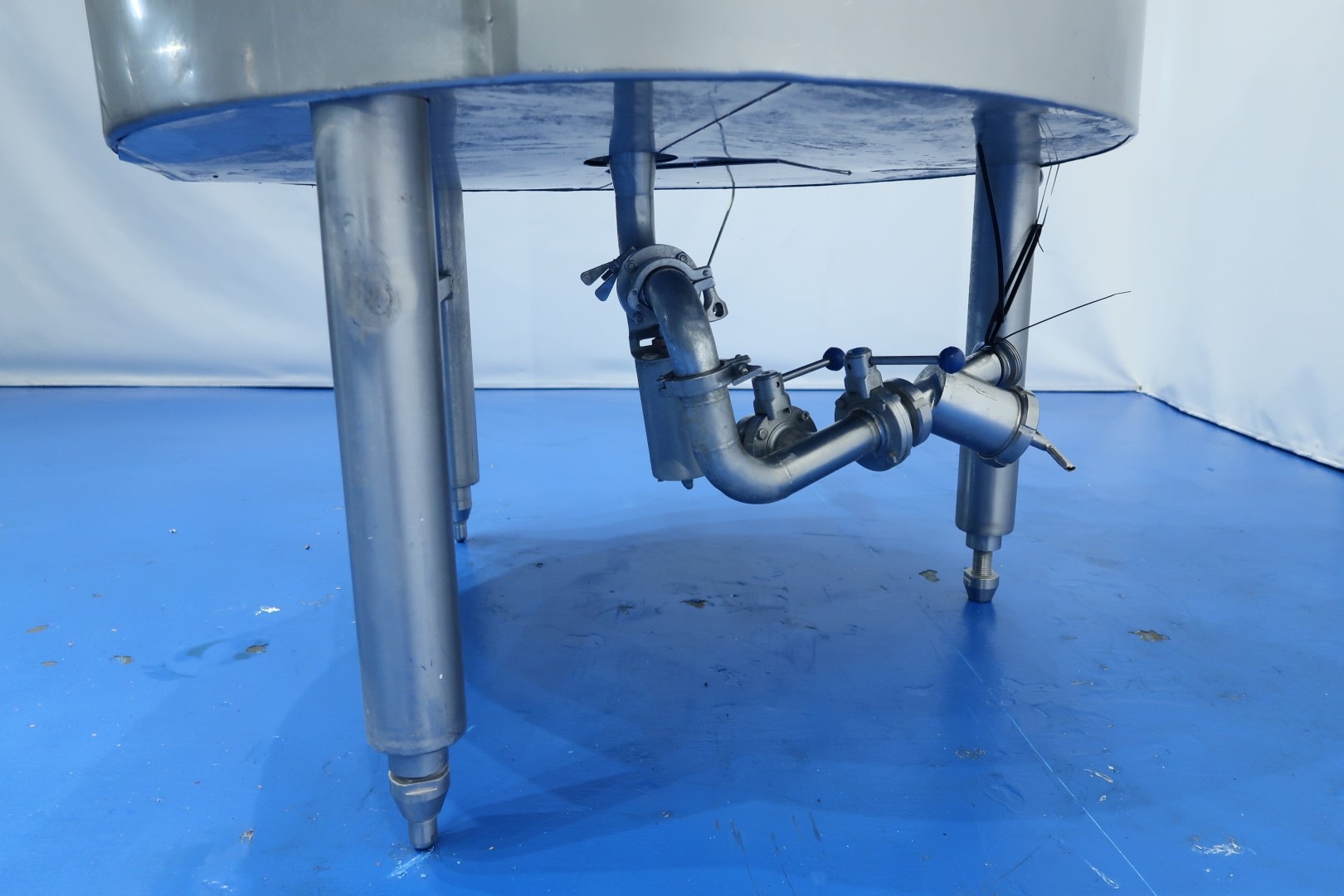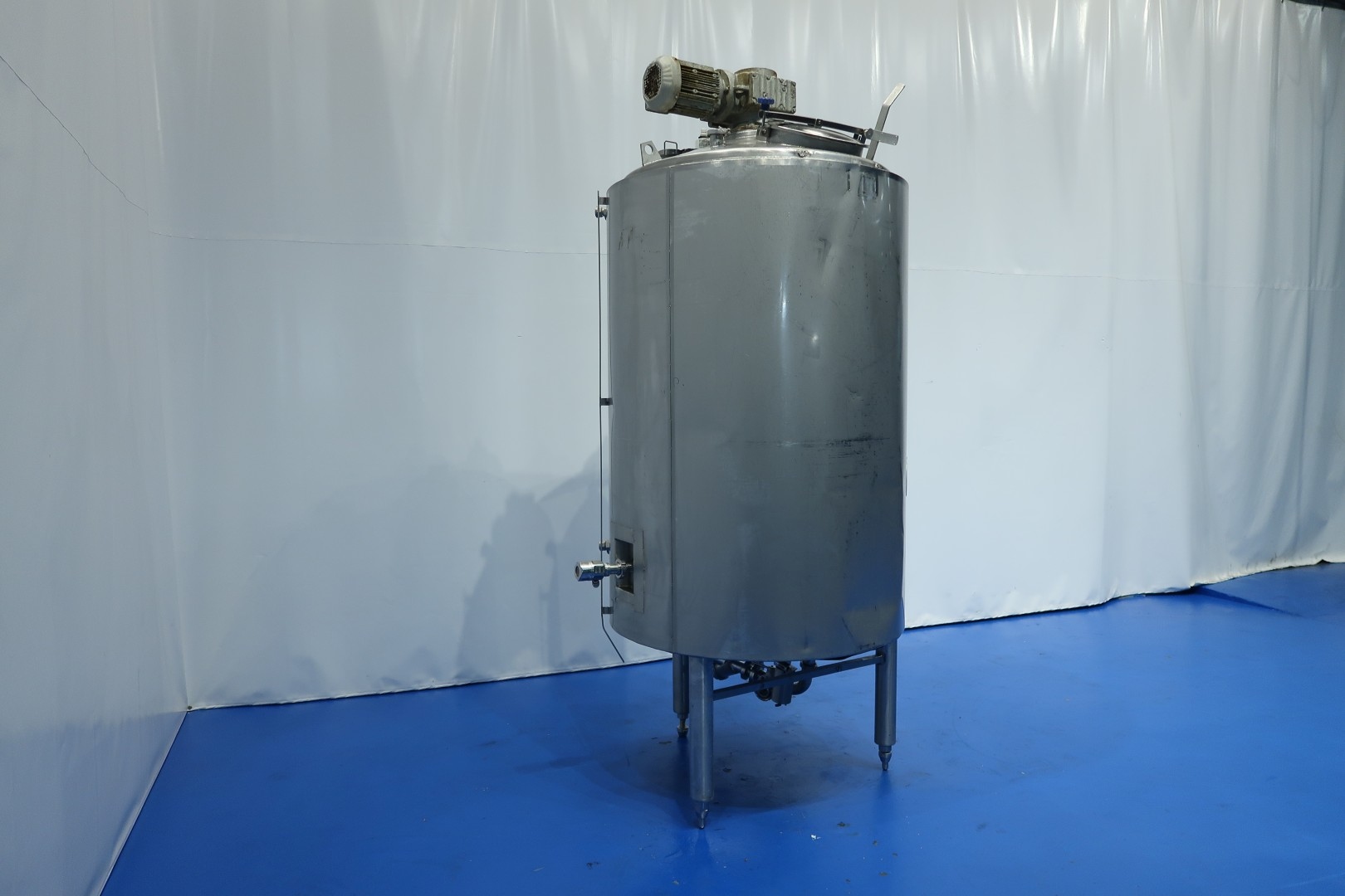 Double jacketed process tank. Top driven Fence-shaped agitator, with bottom bearing. Motor power: 2,2 kW - 4,7 A - n1: 1.425 rpm - i: 97 - n2: 15 rpm. Pressure in jacket: 3 bar. Insulated side and bottom. Product outlet 2" Tryclamp and outlet height: 50 cm. Including pneumatic and manual butterfly outlet valve. Radar level sensor in top make: E&H , type FMR20-38F0/0 , pressure transmitter, breather. 1 CIP spray bowl. Manhole in top, round 40 cm with matching funnel to feed in ingredients. Filter on on outlet. 3 Adjustable feet. Inside dimensions of tank: Ø 108 cm and cylindrical height 164 cm. Total dimensions: 140x140x290 (lxwxh) cm - weight: 680 kg.