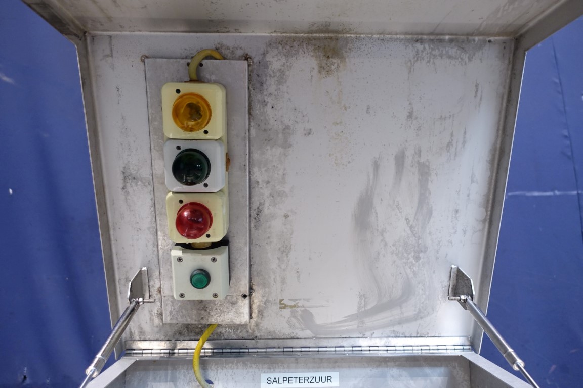 Reception unit for lye or acid or other chemicals delivered by truck. Outside mounted to pump chemicals to a tank.