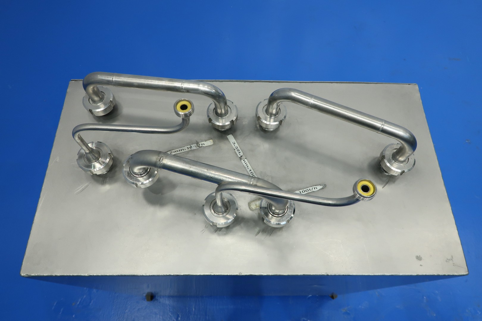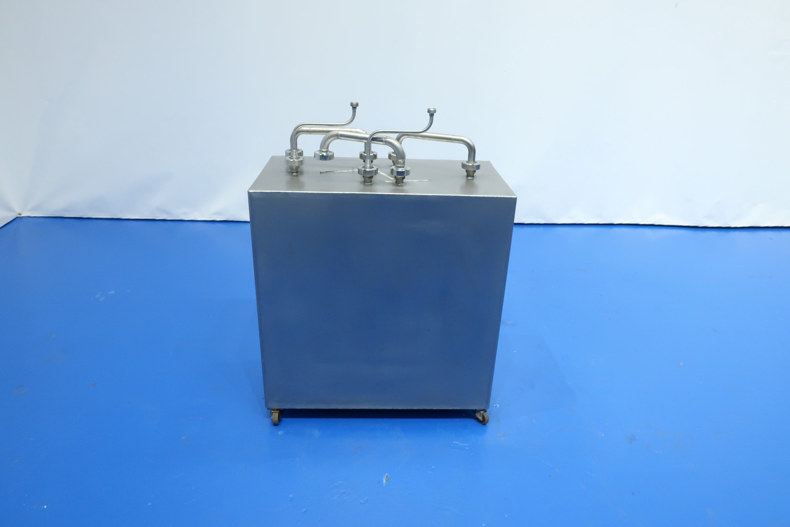 Laboratorium insulated mobile holding with 3 loops. A.) 1.66 ltr - 1min. 100 l/h. B.) 3,32 ltr - 2 min - 100 l/h. C.) 3,23 ltr - 2 min - 100 l/h. Connections: 2 x 1" Din - 2 x 15 mm Din. Total dimensions: 80x43x105 (lxwxh) cm - weight: 96 kg.
