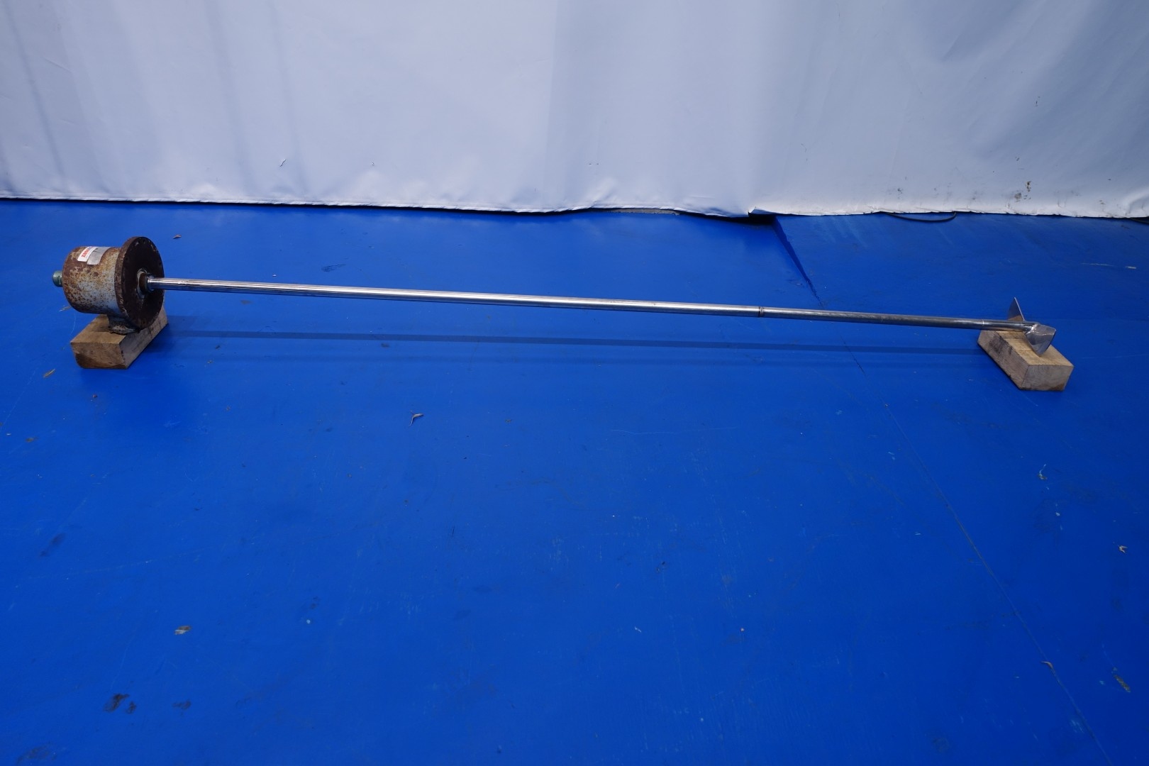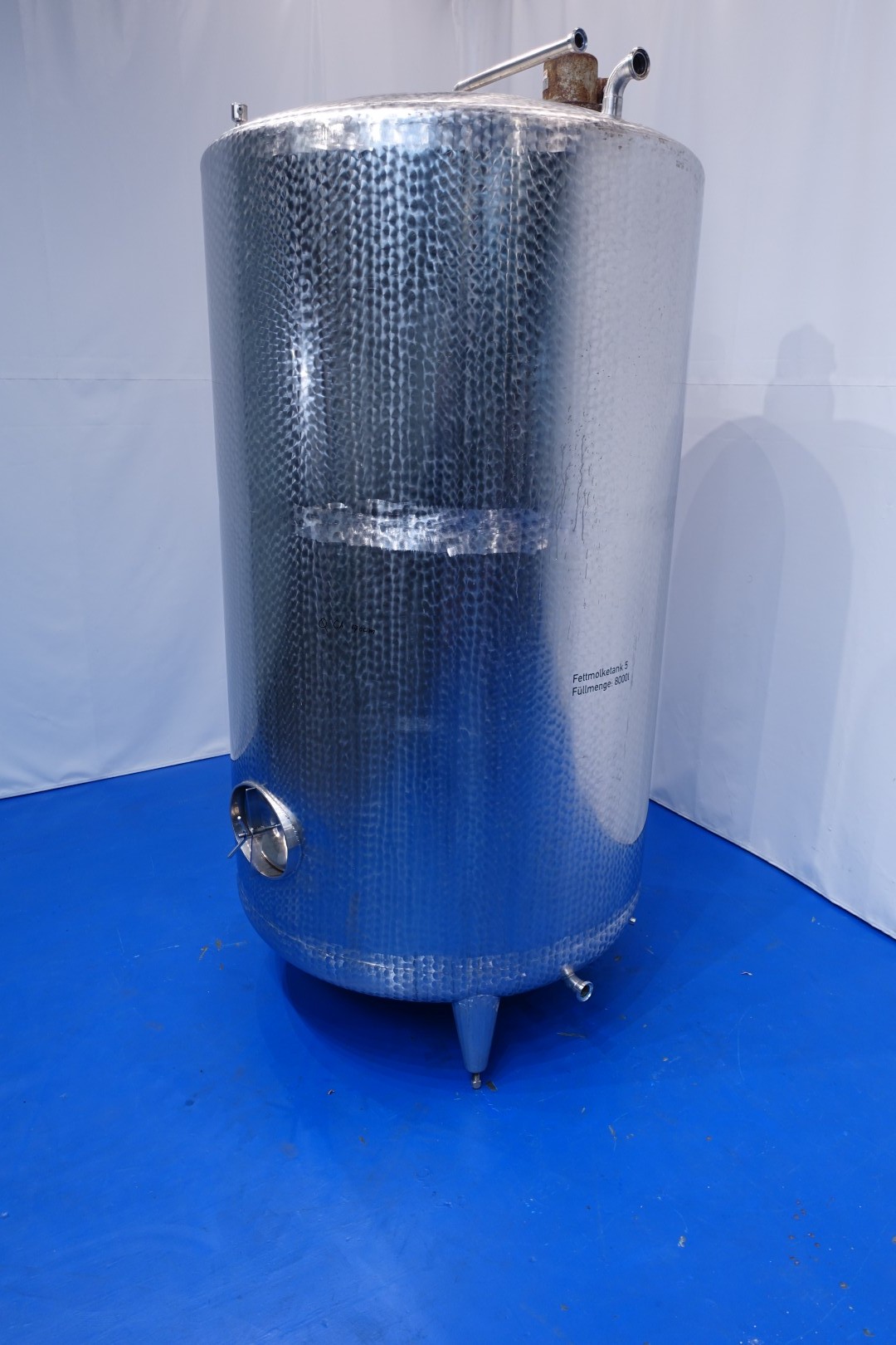 Single jacketed vertical storage tank with propellor agitator. Top driven propellor agitator, motor: 0,25 kW - 1,2 A - n: 470 rpm. Product outlet 2" Din, outlet height: 35 cm. 1 x Level sensor in top and 1 x connection for level sensor low side of the tank. 1 CIP spray bowl. Manhole in side, oval 42,5x32 cm. 3 Adjustable feet. Inside dimensions of tank: Ø 170 cm. Total dimensions: 170x170x365 (lxwxh) cm - weight: 410 kg.