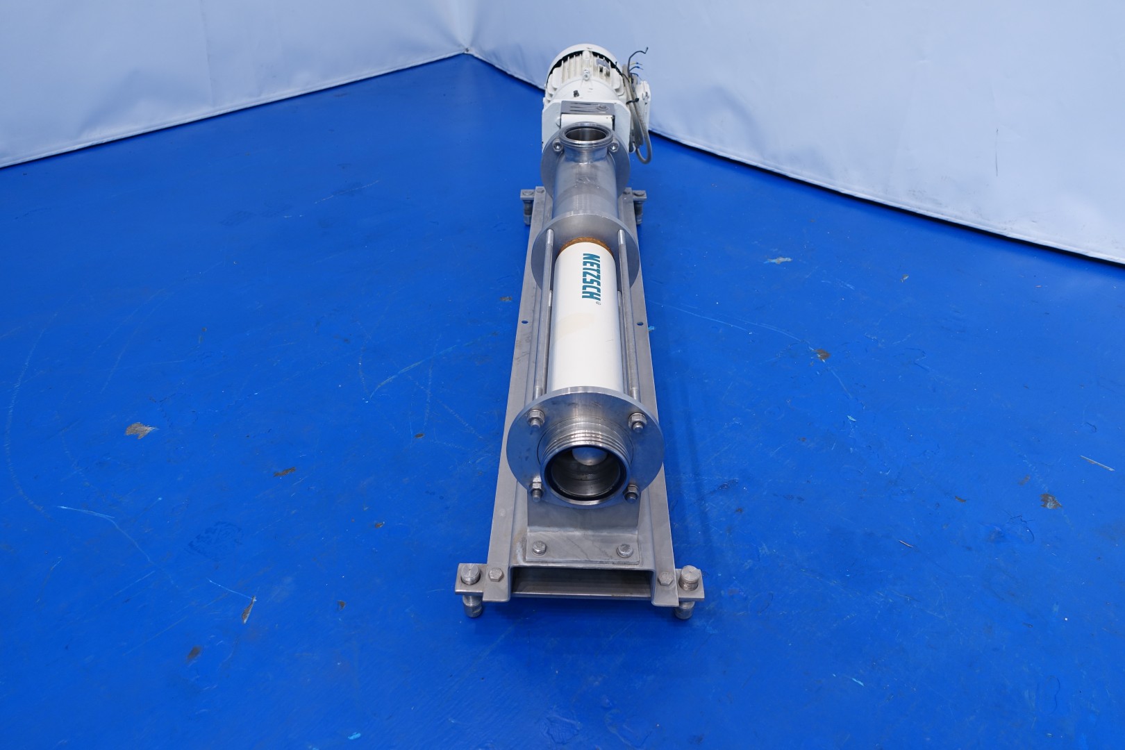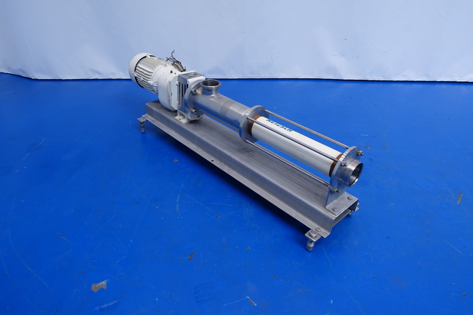 Mono pump - progressing cavity pump. Stator diameter 40 mm. Stator length 55 cm. 4 Windings on SS rotor. Pressure 5 bar. Current motor: 4,5 kW - 8,3 A - n1 1.445 rpm - i = 3,96 - n2 359 rpm (pump speed). On SS frame mounted. Connections: (In) 3" Din / (Out) 4" Din - bypass 2" Din. Total dimensions: 160x35x45 (lxwxh) - weight: 120 kg.