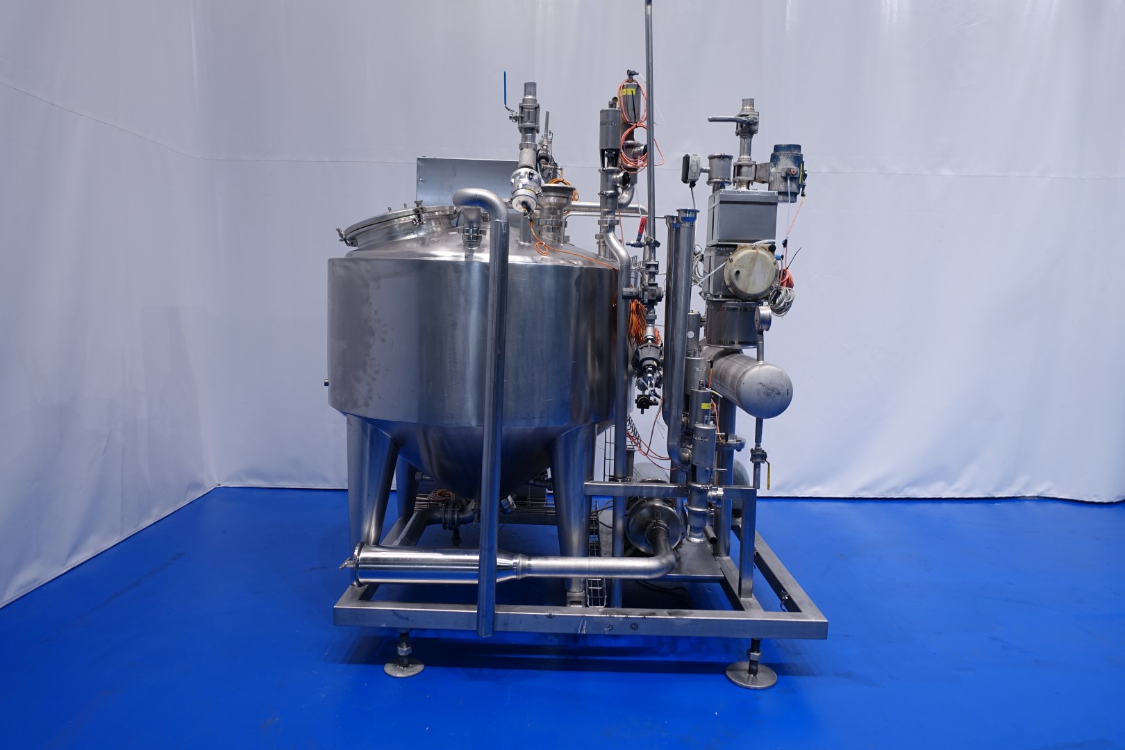 Skid mounted CIP unit which consists of: Tank, tubular heat exchanger and Centrifugal pump. Double jacketed SS tank capacity 1.000 ltrs. - with level sensors on 300/600/900ltr - Temperature sensor, Breather and round manhole in top, spray bowl. Tubular heat exchanger on outlet to heat the cleaing detergent make: IGEFA- type: 203-220-26-900-18 - built in 1991 - no. 29339 - heating surface 2,9 m2 - capacity 17/21 ltrs. - tube length 110 cm - tube head Ø 21 cm - 52 pipes Ø 16,5 mm. Centrifugal pump make: Wiking- 5,5 kW - 11 A - 50 Hz - 2.885 rpm - impellor Ø 175 mm - connections in: DN80 Din - out: DN65 Din. Controls Siemens Simatic. Total dimensions: 230x212x273 (lxwxh) cm - weight: 1.158 kg's. Documentation: PID available.