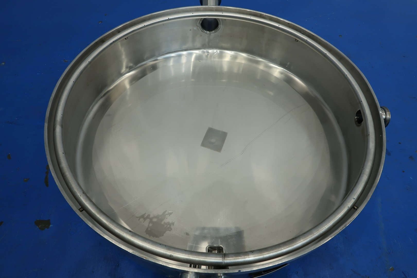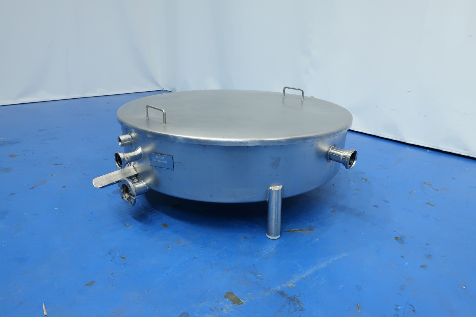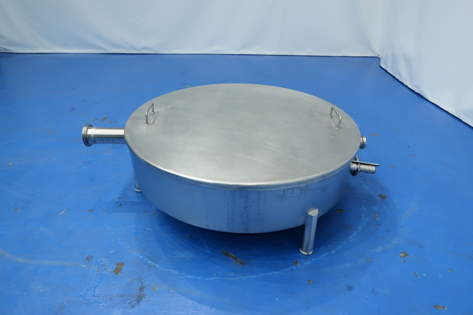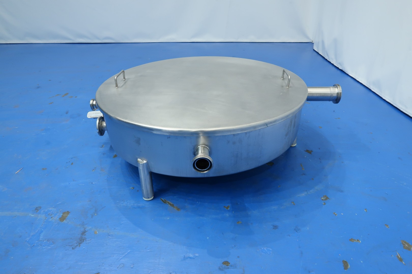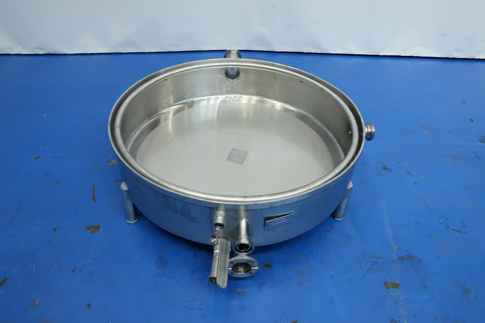 Collection tank, extra low to be placed under a filling machine, press or separator. Previously used to collect pressing whey. With 2 x connection for level sensor (1 included). Diameter 99,5 cm - height: 22 cm. 1 x CIP pipe internally round with holes for cleaning. Connections: 1x 3" Din - 1x 2,5" Din - 1 x 2" Din. Total dimensions: 141x111x43 (lxwxh) cm - weight: 50 kg.