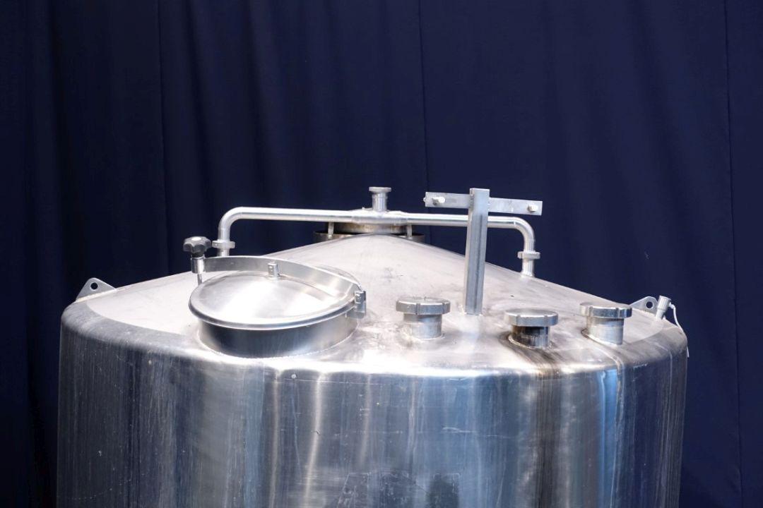 Vertical Quark silo, stark conical for viscose products (like freshcheese/quark), single jacketed. Product outlet by (2 outlets 3" each) with pneumatic butterfly. 2 level sensor and 1 temp, sensor. 2 CIP spray bowl(s). connection for sterile air, Manhole in top, round . 3 Adjustable feet. Inside dimensions of tank: Ø 200cm Total dimensions: 2,3 x h: 3,3 meter.
