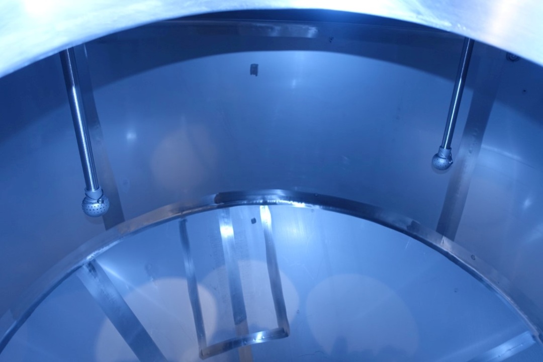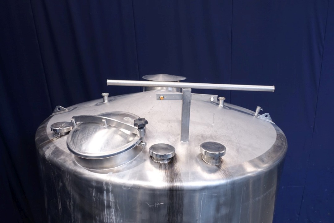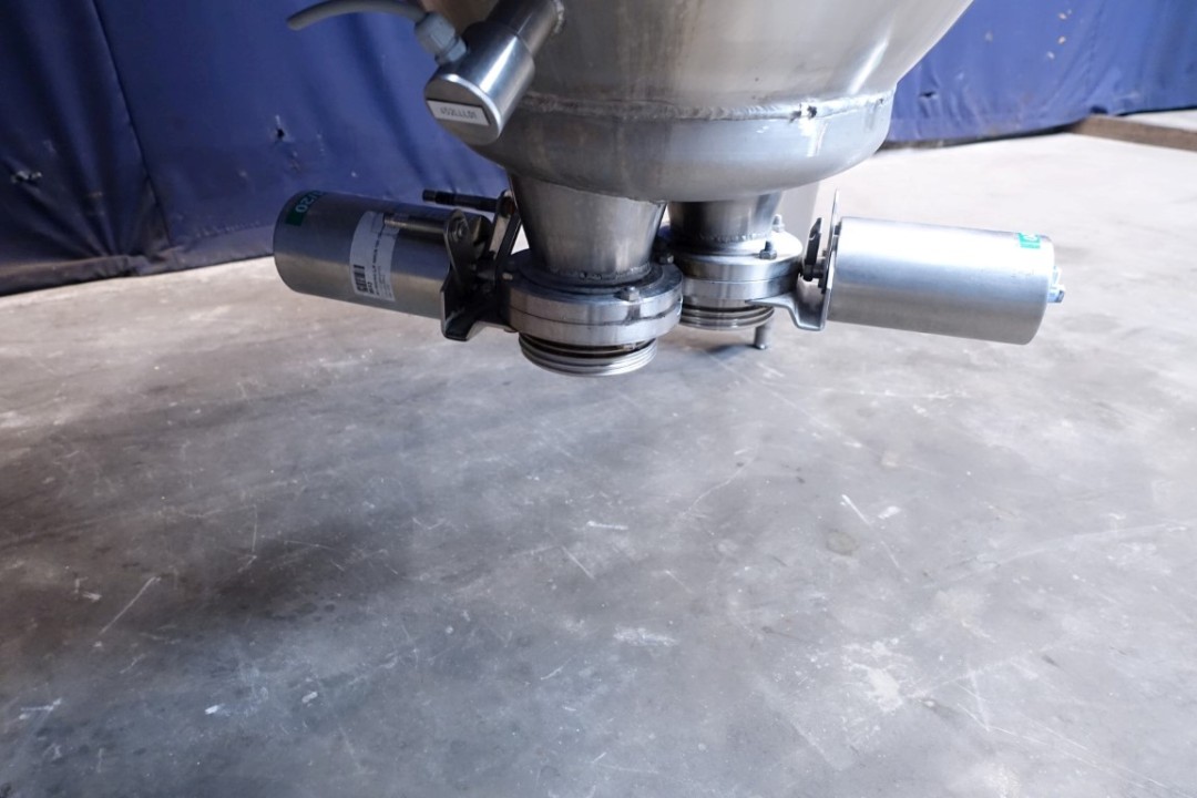 Vertical Quark silo, stark conical for viscose products (like freshcheese/quark), single jacketed. Product outlet by (2 outlets 3" each) with pneumatic butterfly. 2 level sensor and 1 temp, sensor. 2 CIP spray bowl(s). connection for sterile air, Manhole in top, round . 3 Adjustable feet. Inside dimensions of tank: Ø 200cm Total dimensions: 2,3 x h: 3,3 meter.
